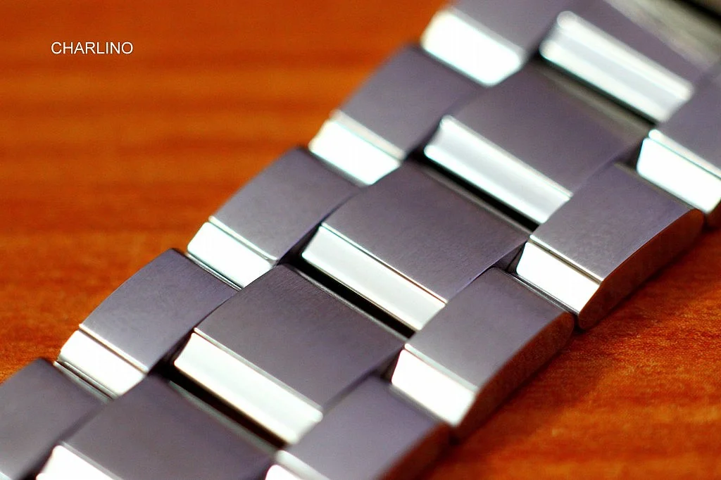 De este también tengo algunas fotos de su brazalete, por supuesto completamente macizo, que si a primera vista parece un sencillo brazalete de tres eslabones cepillados, tiene un finísimo acabado cepillado muy suave y los eslabones rebajados con un escaloncito pulido en su parte inferior, que le da un toque de elegancia al igual que el guilloché de la esfera y otros detalles de acabado, a pesar de ser un reloj herramienta. El Voyager es un instrumento de viaje, con regla de cálculo, función GMT, reserva de marcha, wr.100m con sus dos coronas roscadas, pero con clase.