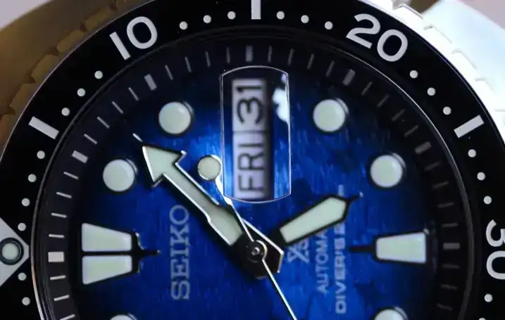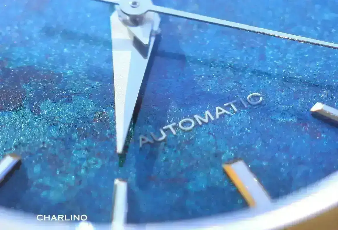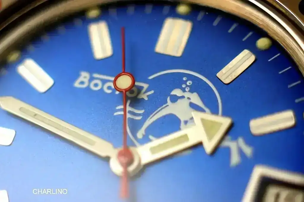 El bonito Vostok Amphibia Scuba dude azul, que ya lleva más de once años conmigo; el azul de este reloj es precioso, y visto de cerca no se puede decir que tenga unos acabados finos, solo hay que ver la irregularidad en sus apliques de las horas, pero son unos acabados con un encanto muy particular, las pinturas y los detalles parecen de reloj antiguo hecho a mano, menos industrial, como de otra época. El caso es que me gusta ver estos relojes rusos al detalle. Y el buceador de esta esfera es una decoración muy bonita.