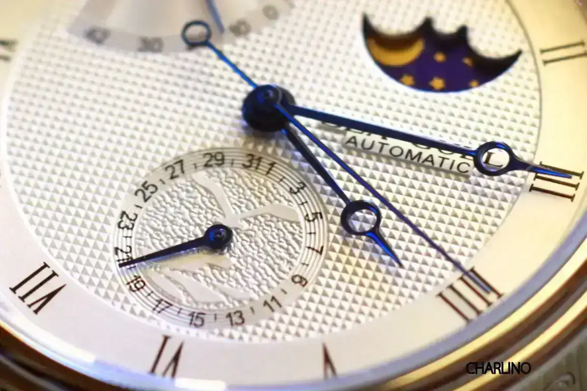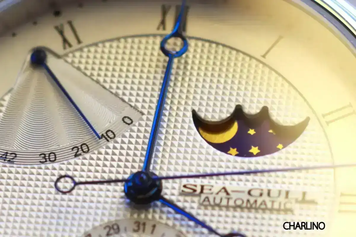 Hoy pondré fotos de varios relojes más. Mi Sea-Gull ST2153 Reserva de marcha y Fases lunares; sus acabados no son tan finos como los del Orient Star Retrograde, por compararle con otro complicado con guilloché, pero no está mal, y las agujas se ven muy bonitas. Visto de cerca se puede apreciar algo que a simple vista pasa más desapercibido, la decoración que lleva en la subesfera del calendario a las seis; es una representación de la gaviota volando sobre el mar, como el logotipo de la marca pero más bonito.