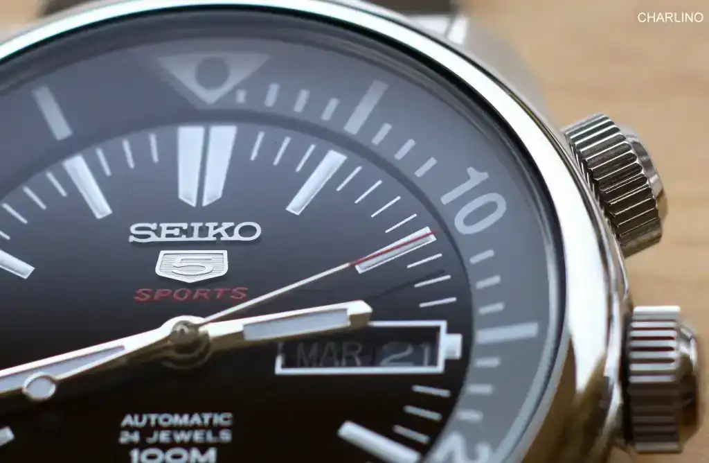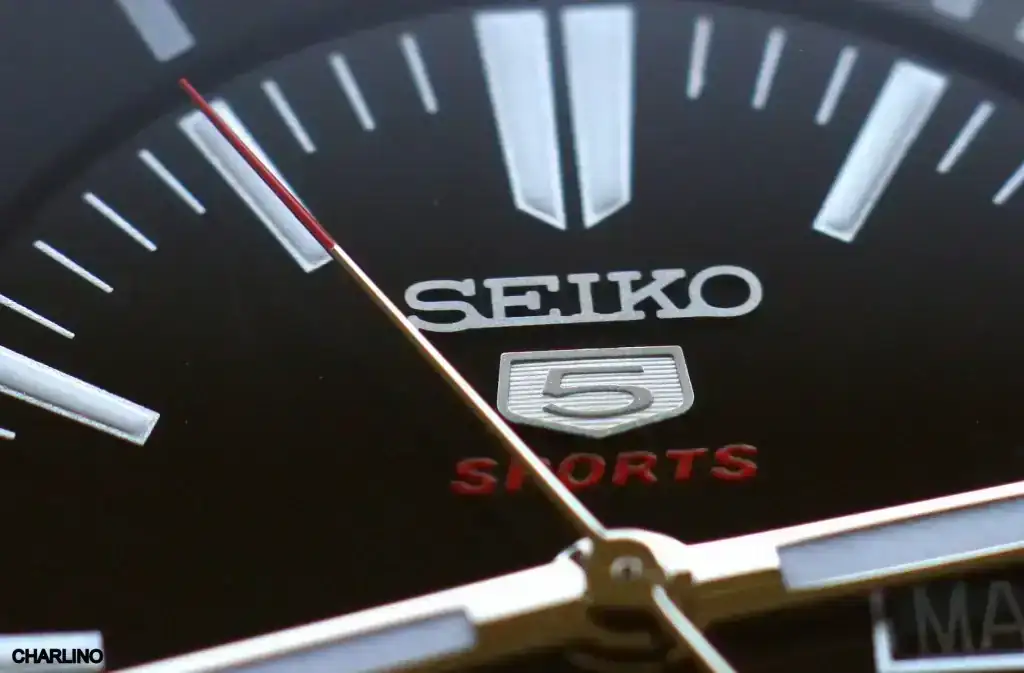 Más fotos de cerca, estas de mi Seiko 5 Sports Compressor. Los Seiko 5 Sports clásicos tenían unos detalles de acabado que los diferenciaban de los Seiko 5 normales. Este tiene bastantes de estos detalles en la caja, en la esfera y en el segundero, que hacen que dentro de la sencillez de estos relojes, se vea bastante elaborado.