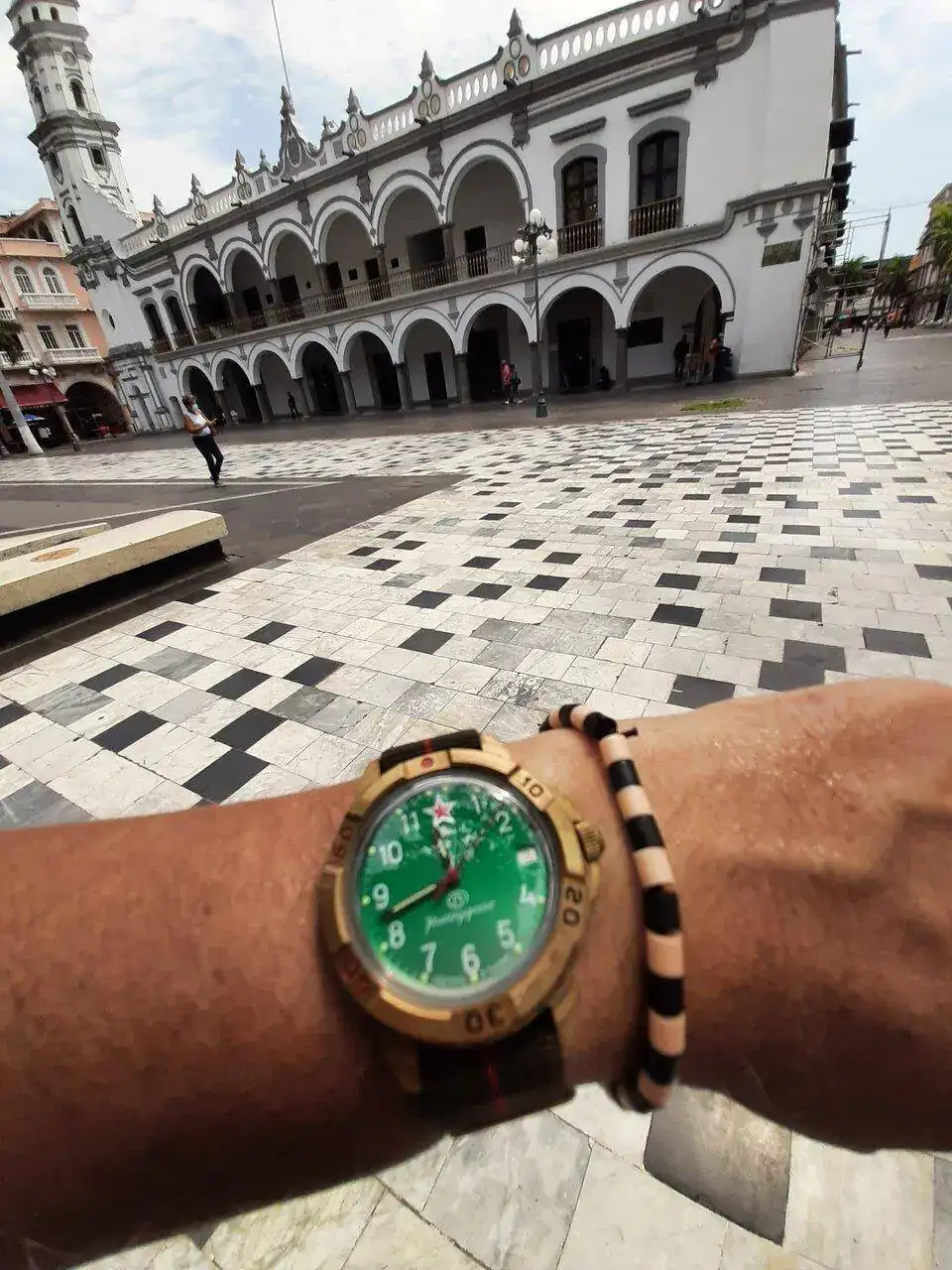 Un Komandirskie "brasseado" y de fondo el palacio municipal de Veracruz.