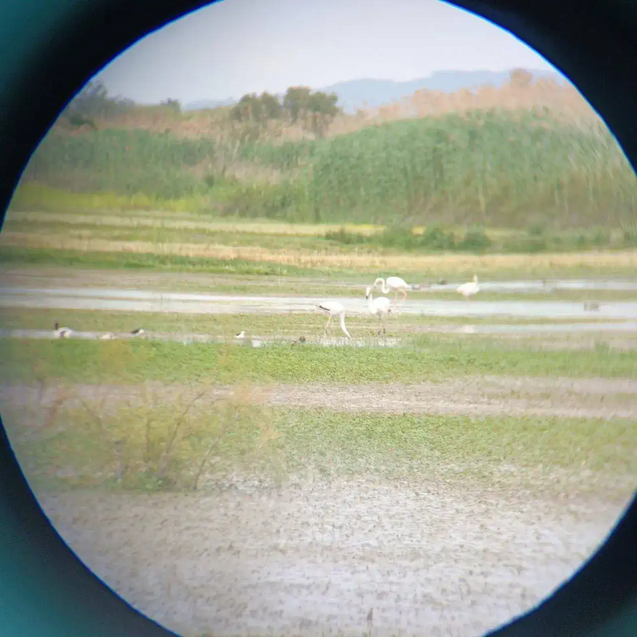 Resulta sorprendente la biodiversidad en este lugar, atrapado entre el aeropuerto del Prat y la ciudad de Barcelona. Hemos visto muchas especies de aves, incluyendo flamencos. La foto de los mismos a través del visor del prismático no es gran cosa, pero con un móvil y con niños hambrientos alrededor, no he podido hacer más.