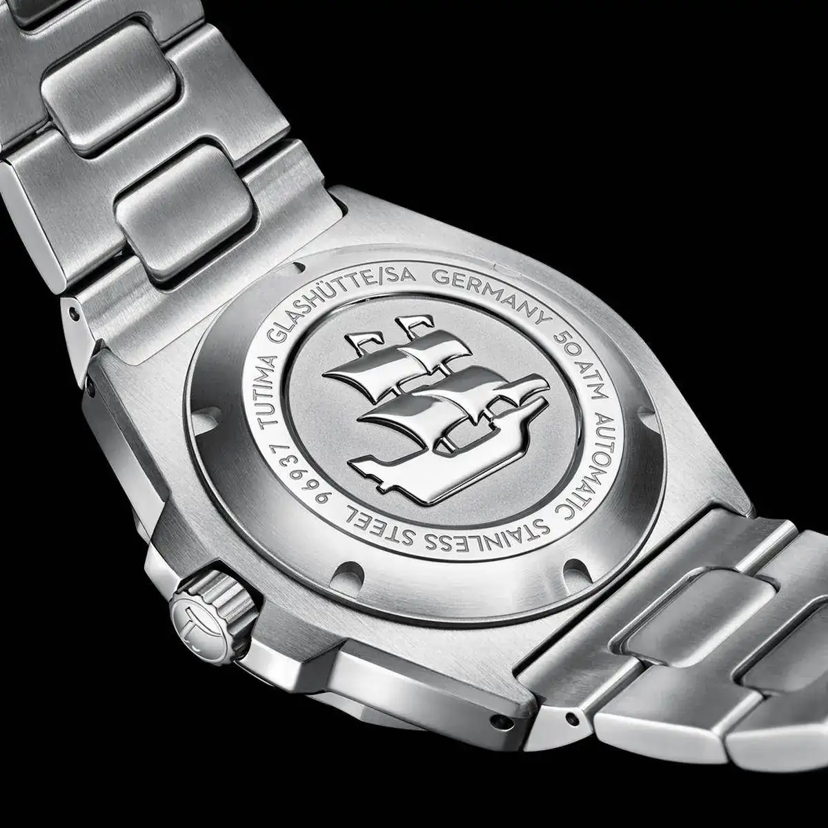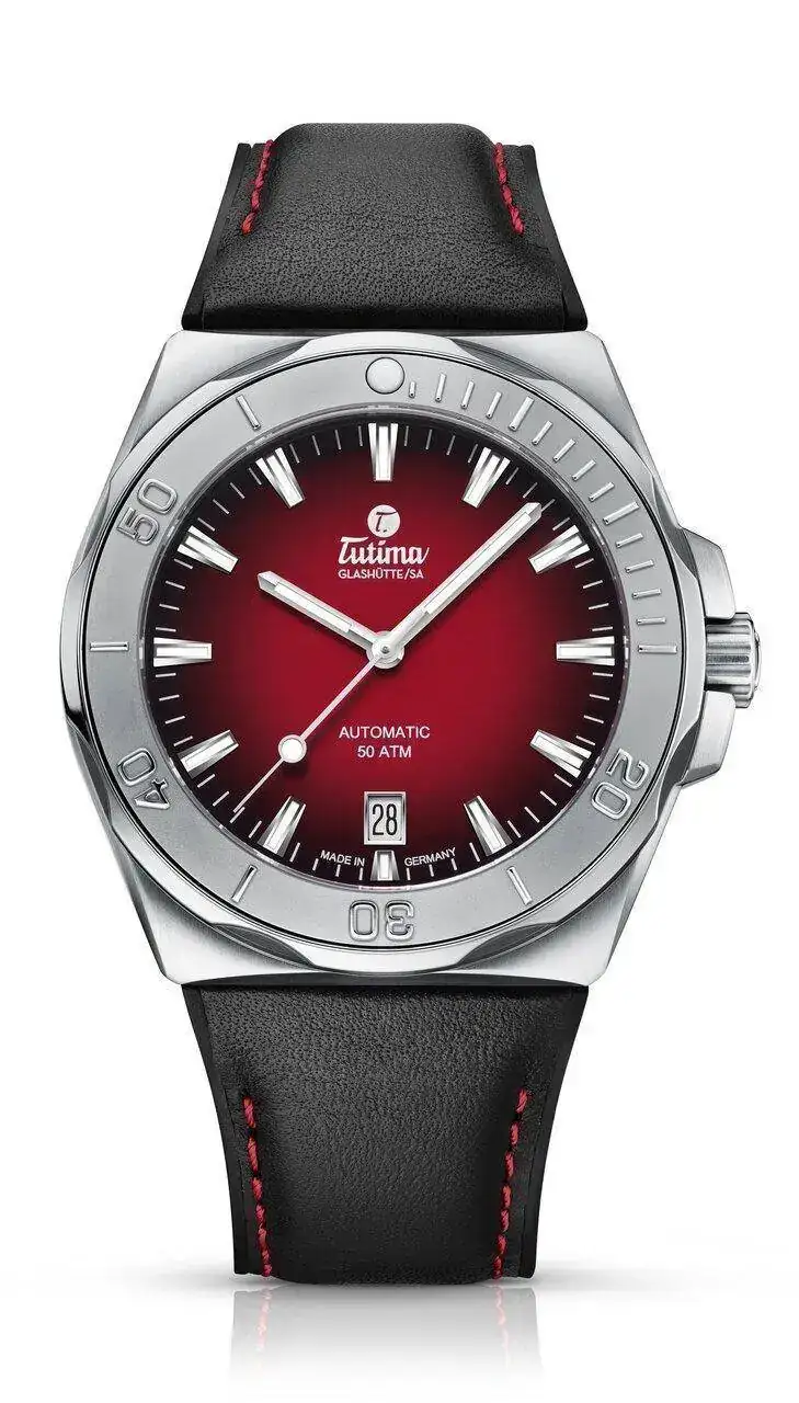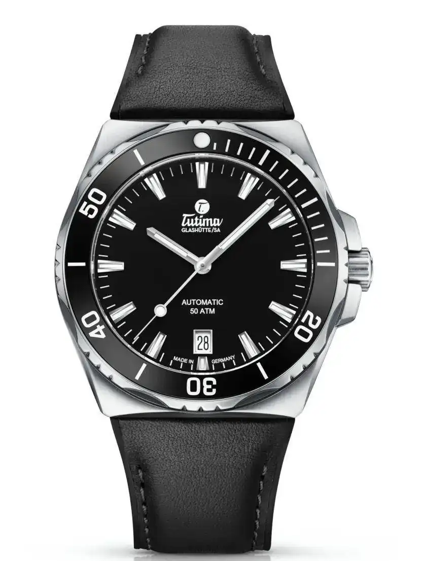 El movimiento es el calibre automático suizo Tutima 330 con 25 joyas, 28.800 vph y una reserva de 38 horas. Sello dorado en el rotor. Las funciones son: horas, minutos, segundos centrales y fecha.