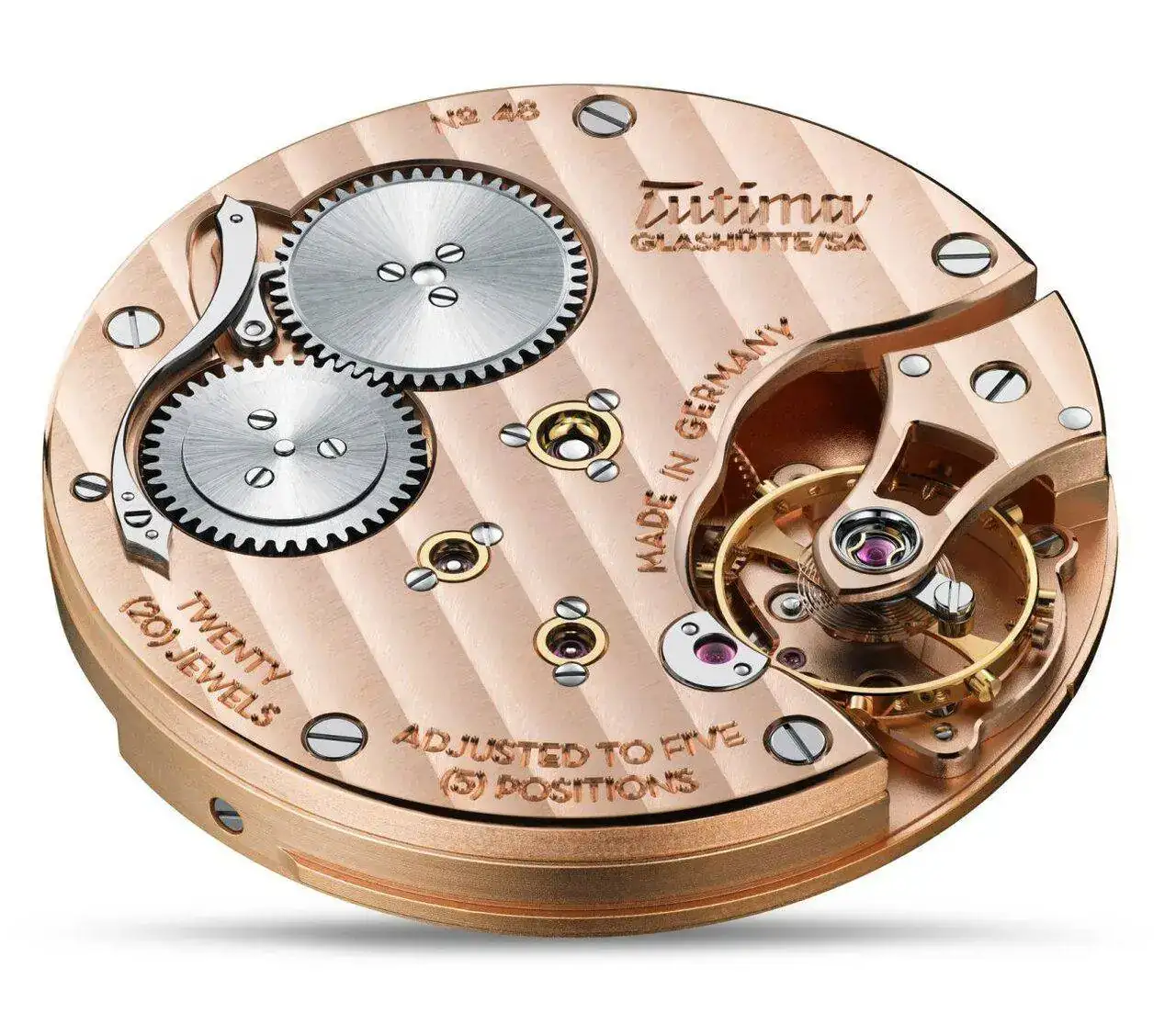 El movimiento es el calibre interno Tutima manual 617 con 20 joyas, una reserva de marcha de 65 horas. Cuenta con una placa de tres cuartos de Glashütte con tres rodamientos de rubí engastados en chatons de oro atornillados. Equilibrio de tornillos con tornillos de peso y cuatro tornillos reguladores en orificios roscados ranurados. Sistema oscilante sin índices con resorte tipo Breguet, cuya curva final se dobla manualmente en sus talleres de acuerdo con cálculos especiales.