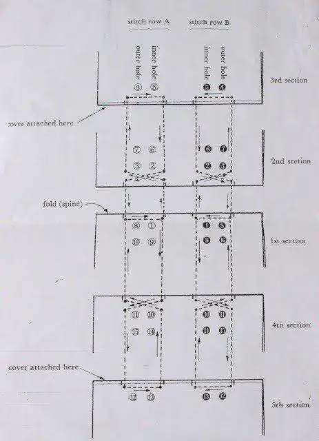 Cada sección corresponde a un cuadernillo. Empieza en el agujero número 1, desde el interior del cuadernillo hacia fuera para insertar la aguja en el número 2. El hilo saldrá nuevament a la superfície en el número 3 y será insertado de nuevo en el número 4, y así hasta el 16. Puedes usar dos hilos diferentes para cada hilera de agujeros. Ten en cuenta que los números 2 y 6, 3 y 7, 1 y 9, 8 y 16, 10 y 14, y 11 y 15 corresponden al mismo agujero.