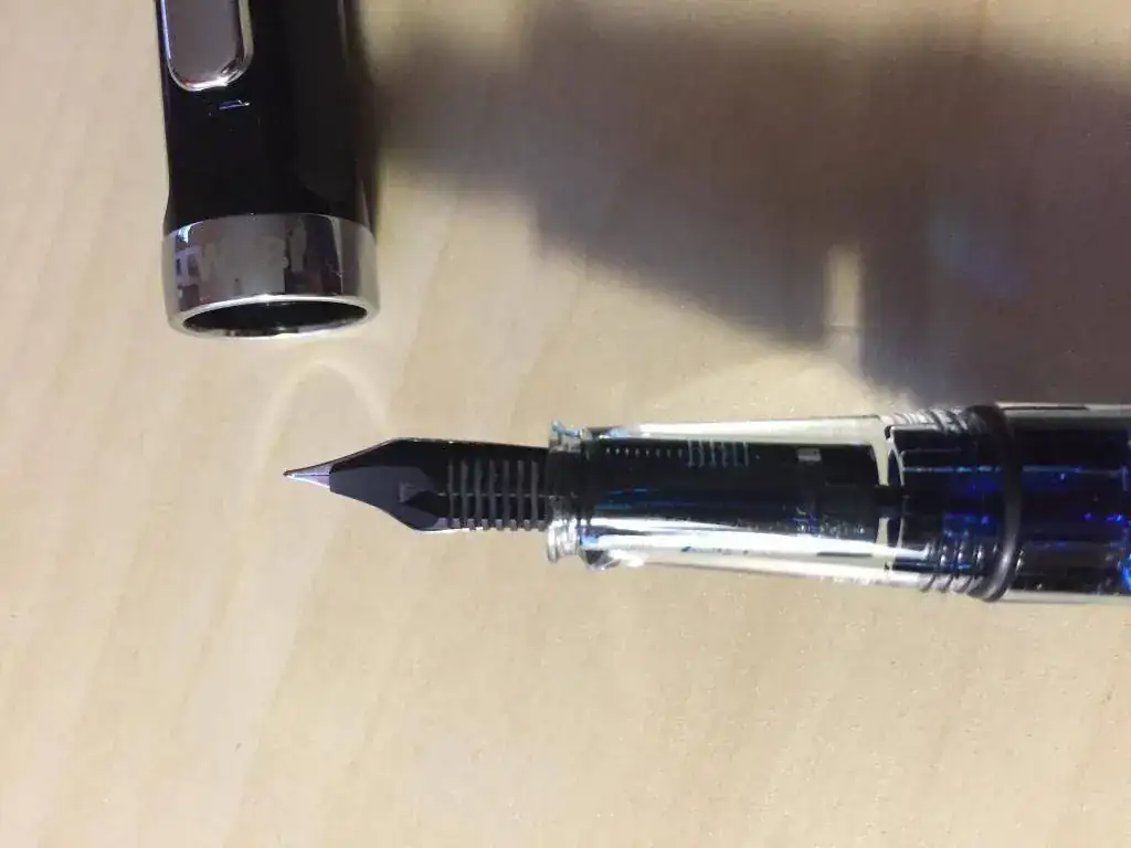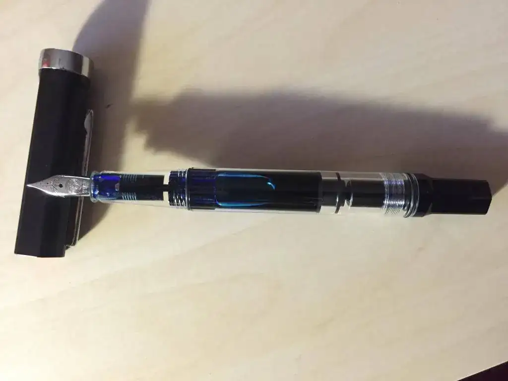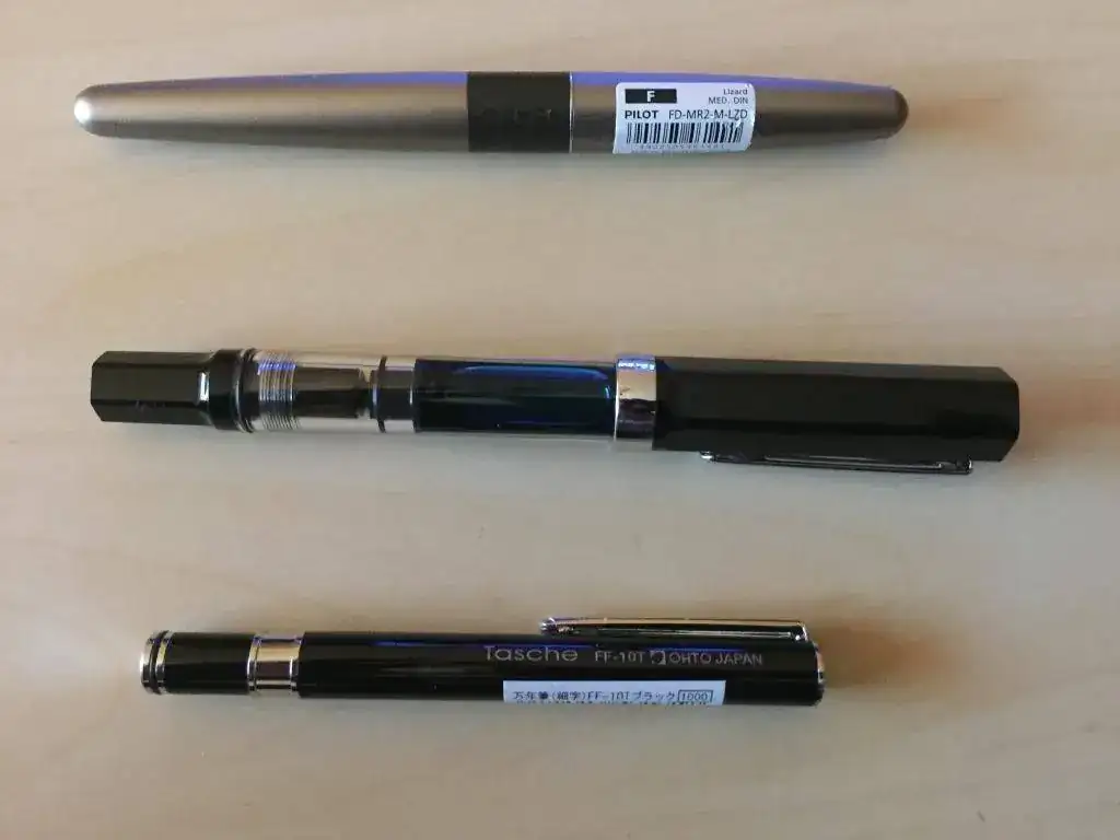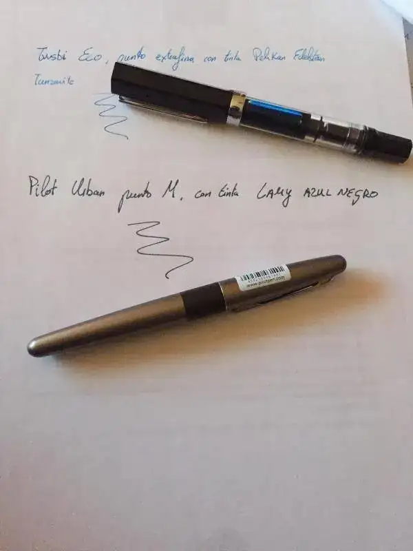 Aqui os dejo la twsbi eco, en la primera foto una comparacion de tamaño con la Pilot Urban, y una Ohto Tasche. Está entintada con una Pelikan edelstein Tanzaniteimage.webp