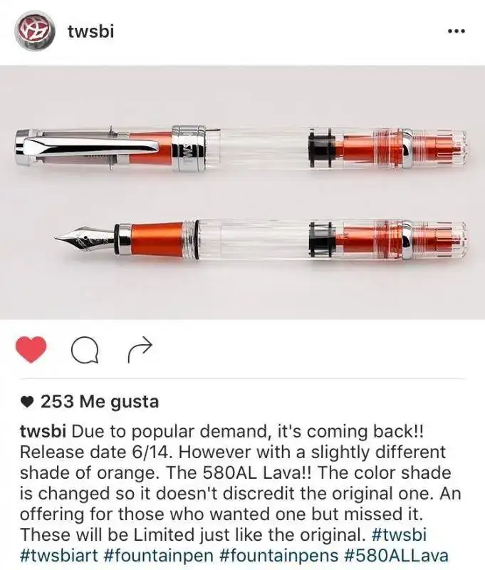 Acabo de leer que van a volver a sacar la Twsbi 580 AL lava, pero en otro tono de naranja. Así que el que no la tenga, ahora hay otra oportunidad. Dicen que debido a la gran demanda. :hmm: Pues ya podían volver a sacar la mini blanca, digo yo. En fin...