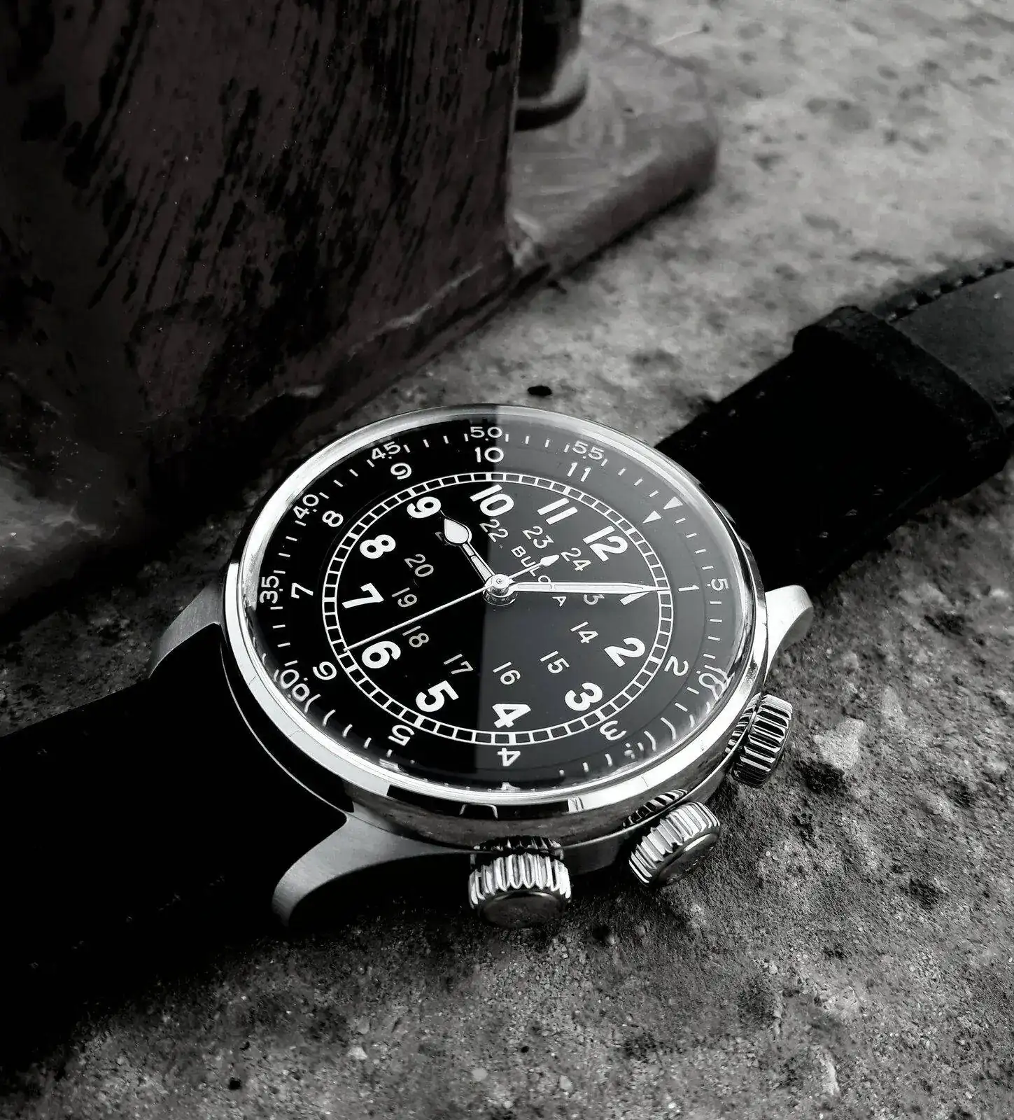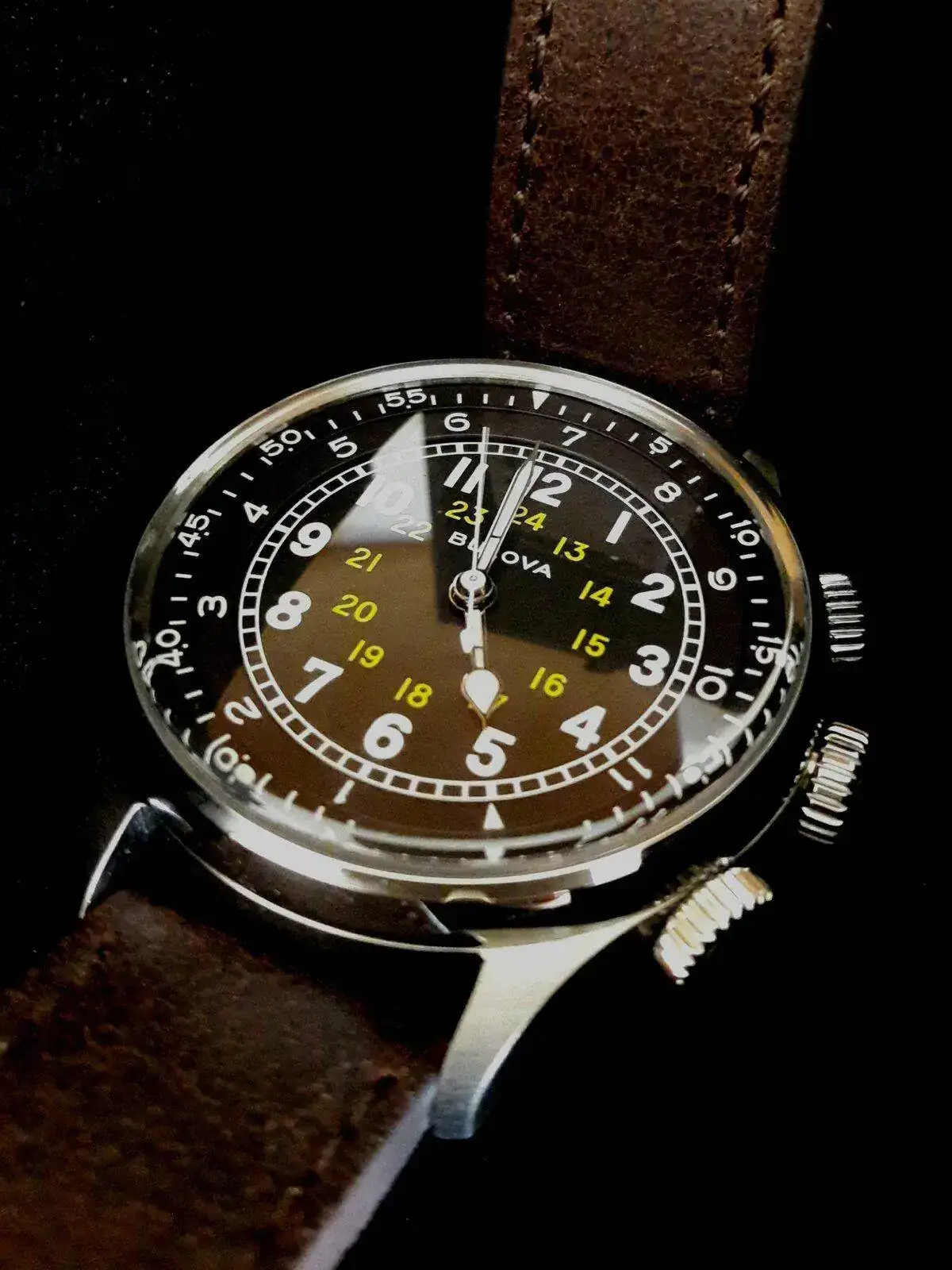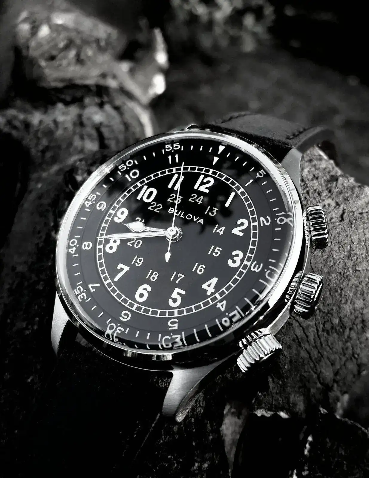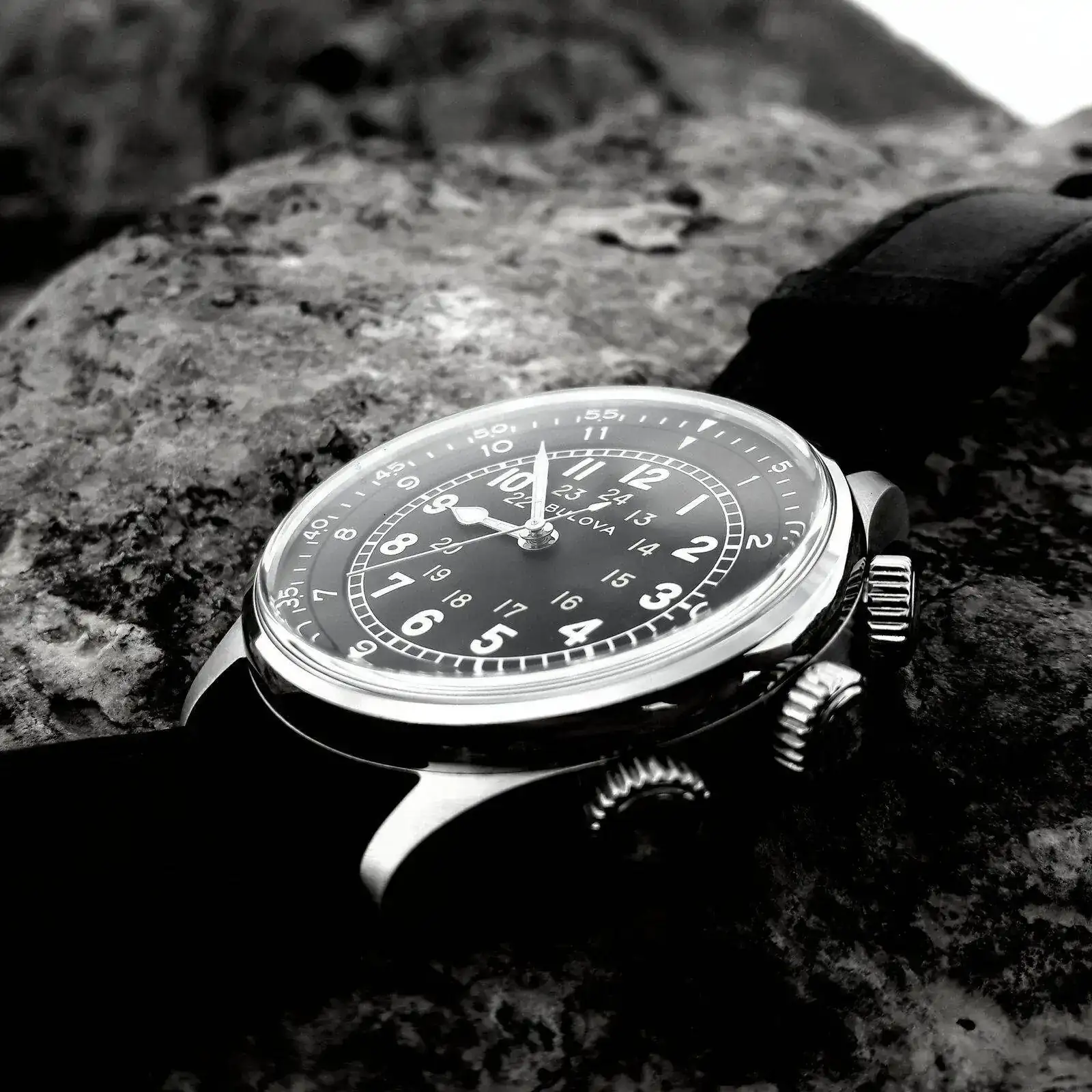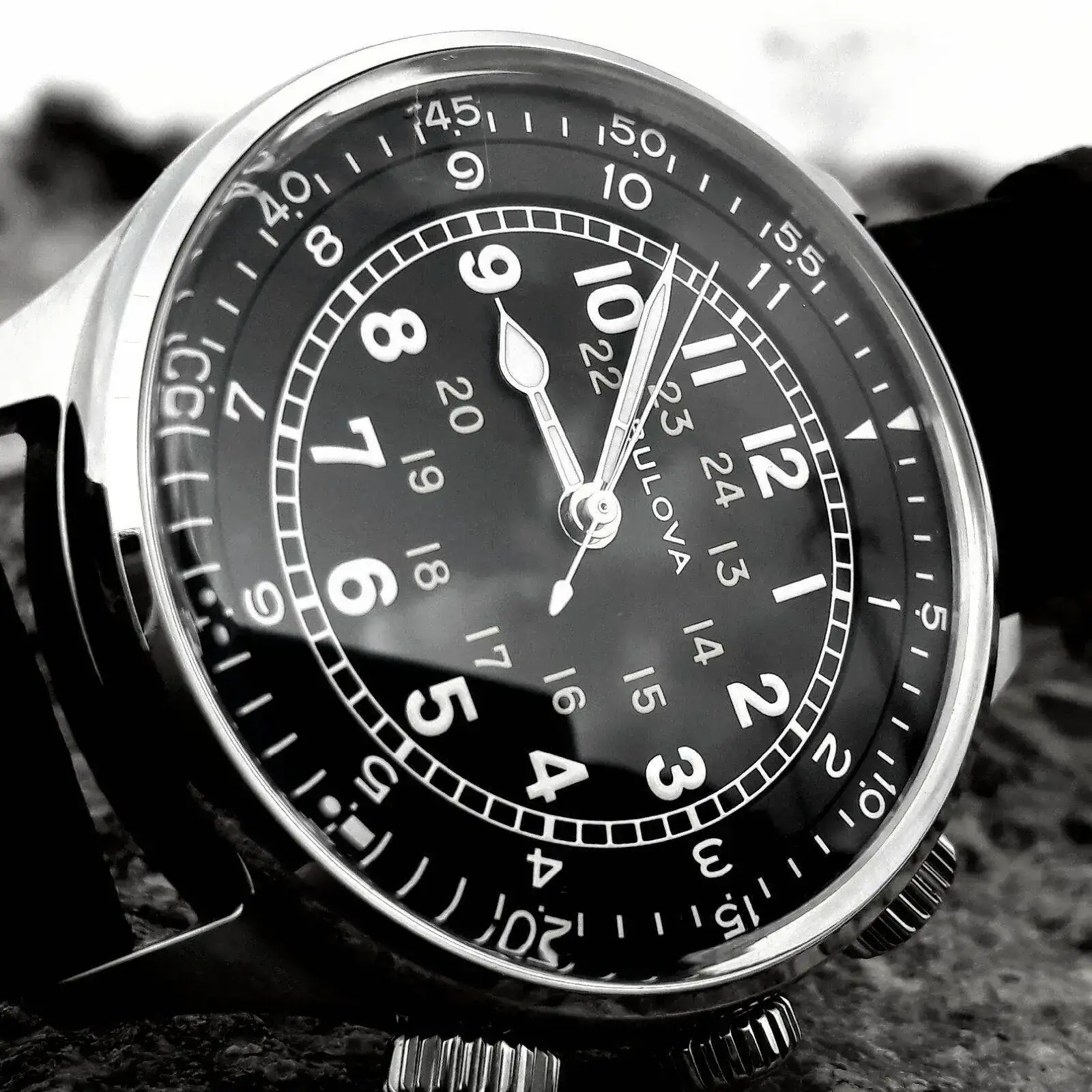 Nos encontramos un dial negro mate, muy apropiado para minimizar reflejos, tan sólo podemos leer BULOVA como única concesión a la literatura, el resto está dedicado a la medición.