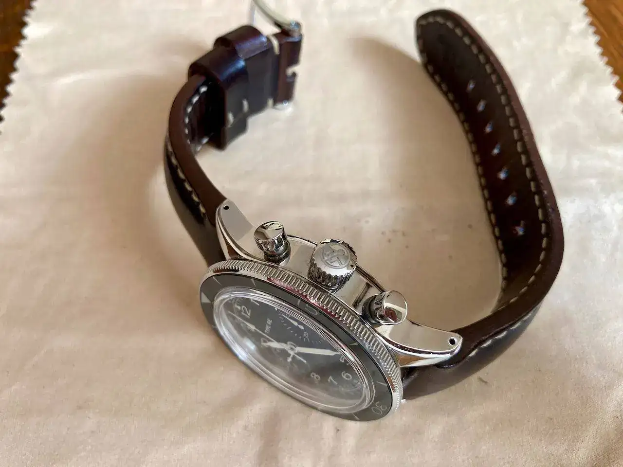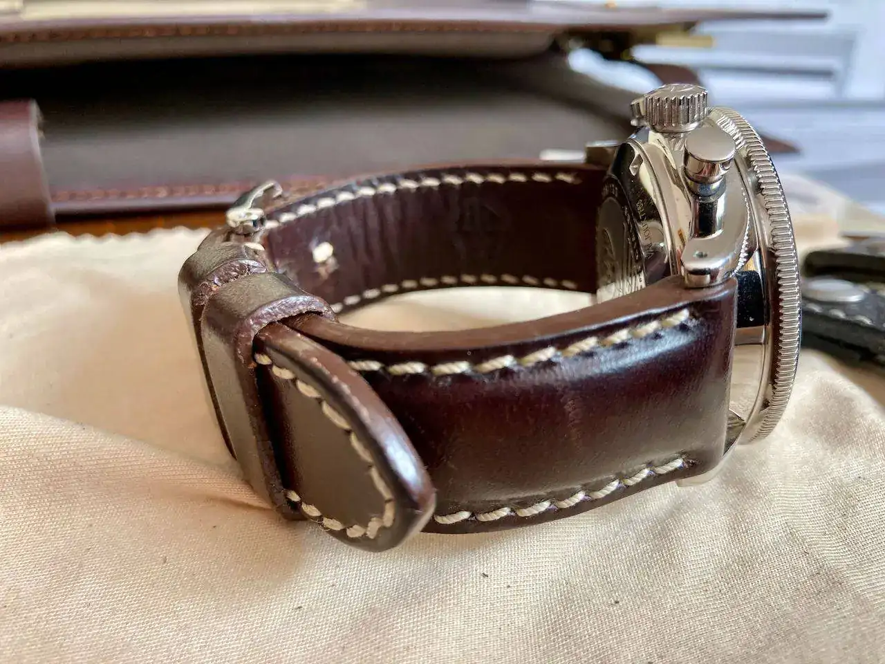 Se añade una correa de piel tipo 'piloto' de gran calidad y ajustada a medida a las características especiales de este reloj.