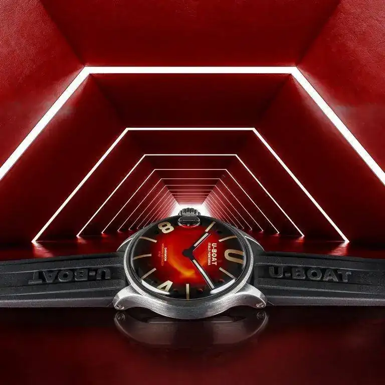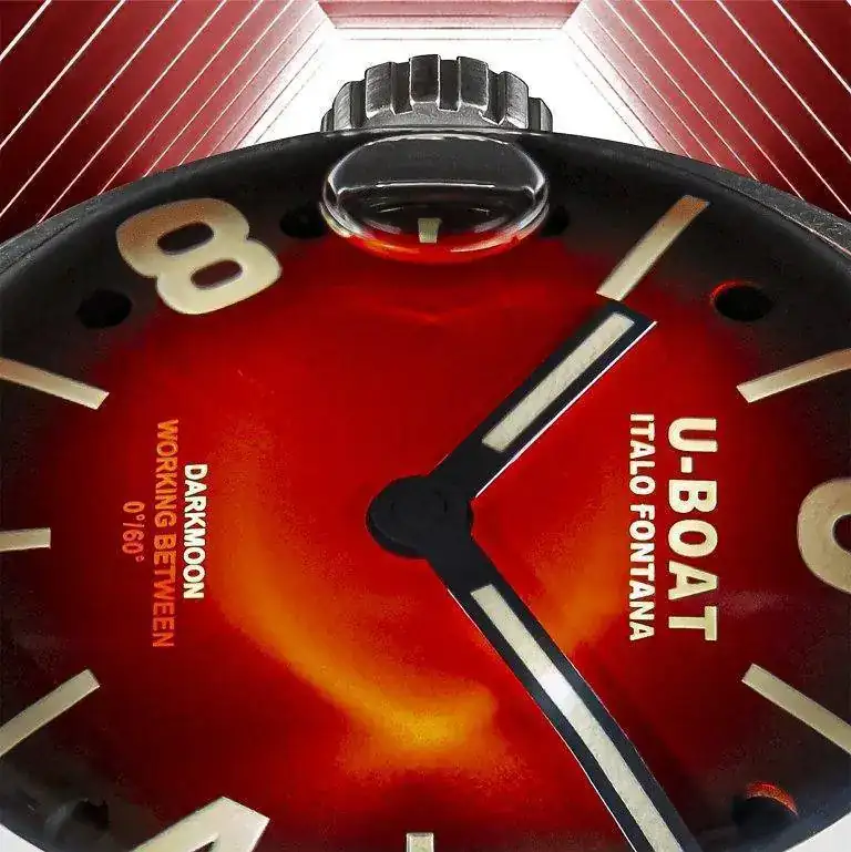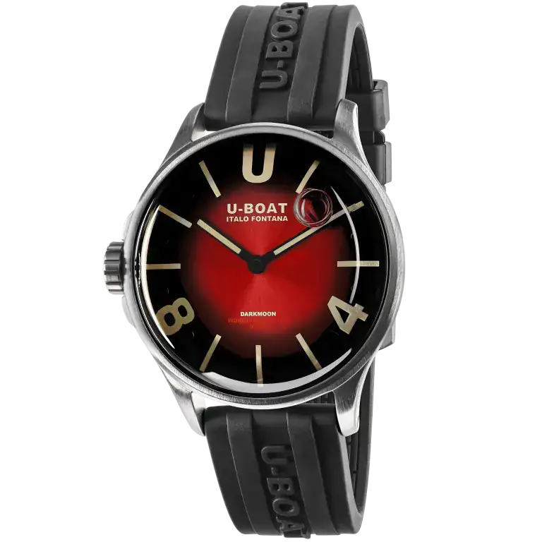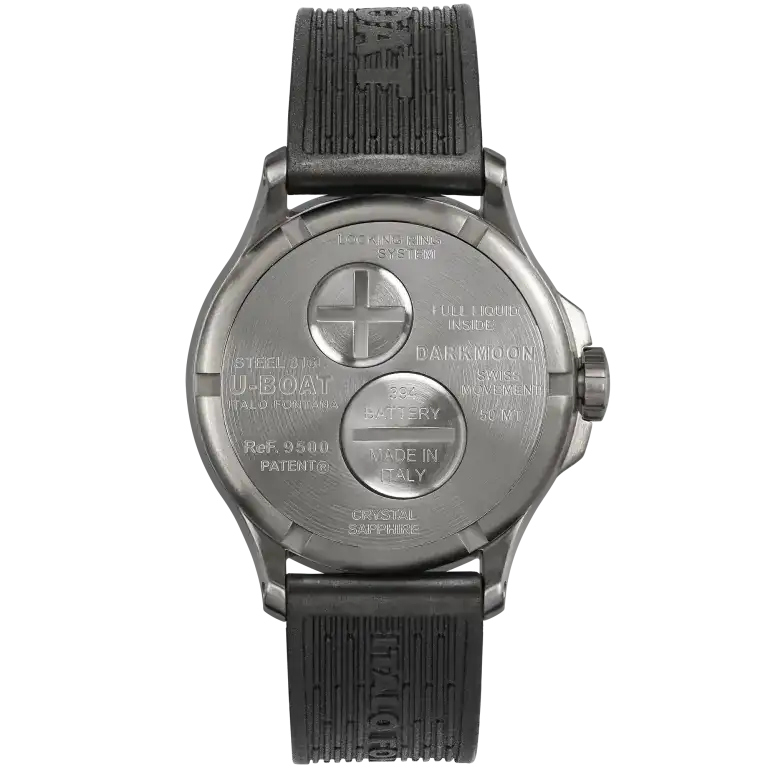 correa de caucho vulcanizado ultra resistente, de color negro con el logotipo de U-Boat en relieve. Ancho: 20/18 mm Hebilla de acero con tratamiento PVD bronce vintage.