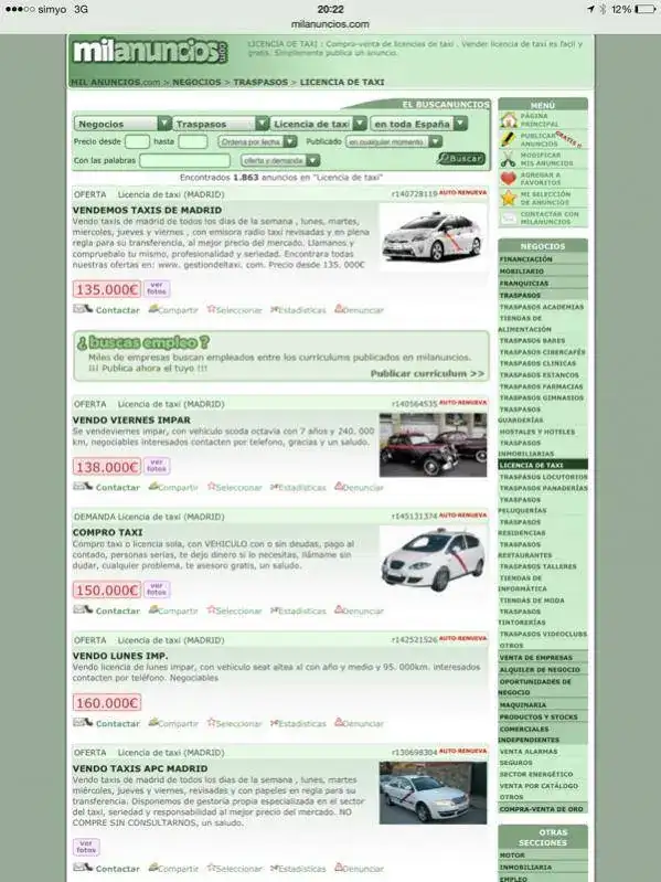 Efectivamente no es lo mismo, una es una licencia de explotación, como tu bien dices, y una vez "explotada" debería volver al órgano que la licenció, es mi opinión claro, la otra es un puesto adquirido por oposición libre en "propiedad"..., de todas formas no era ese el fondo de mi cometario ni quiero con eso decir que lo de los funcionarios fuese una buena idea, solo trataba de hacer una comparación quizás desafortunada, el tema está en que si las plazas de taxista volvieran al ayuntamiento una vez terminada la explotación todos ganariamos, el ayuntamiento embolsaría una nueva cantidad de dinero al sacarla a concurso público nuevamente y los futuros taxistas tendrían licencias a precios acordes con la realidad, bueno, no todo el mundo ganaría y, seguro, no hace falta que diga quién no lo haría...