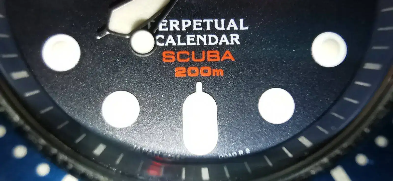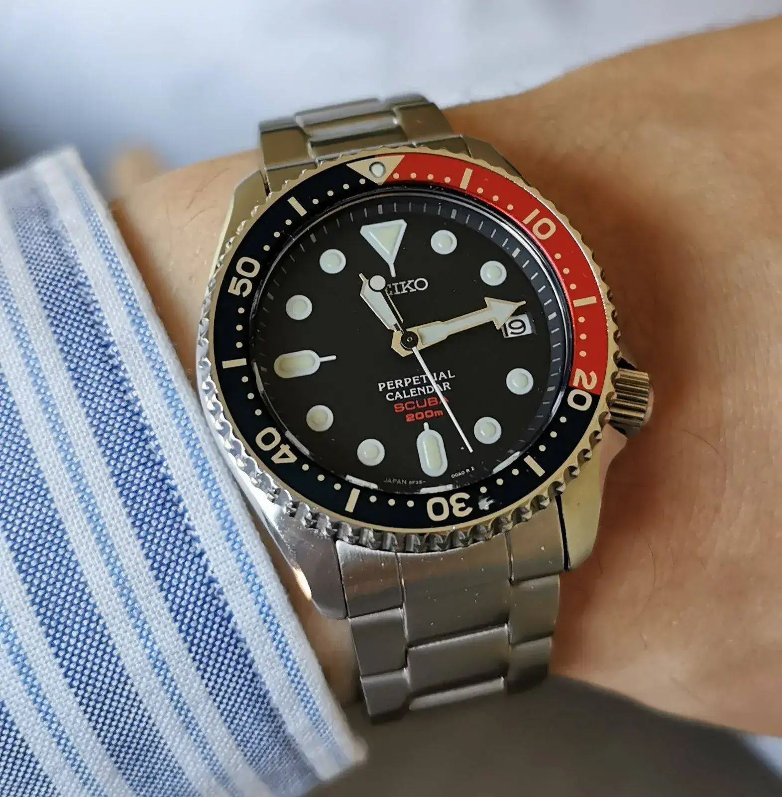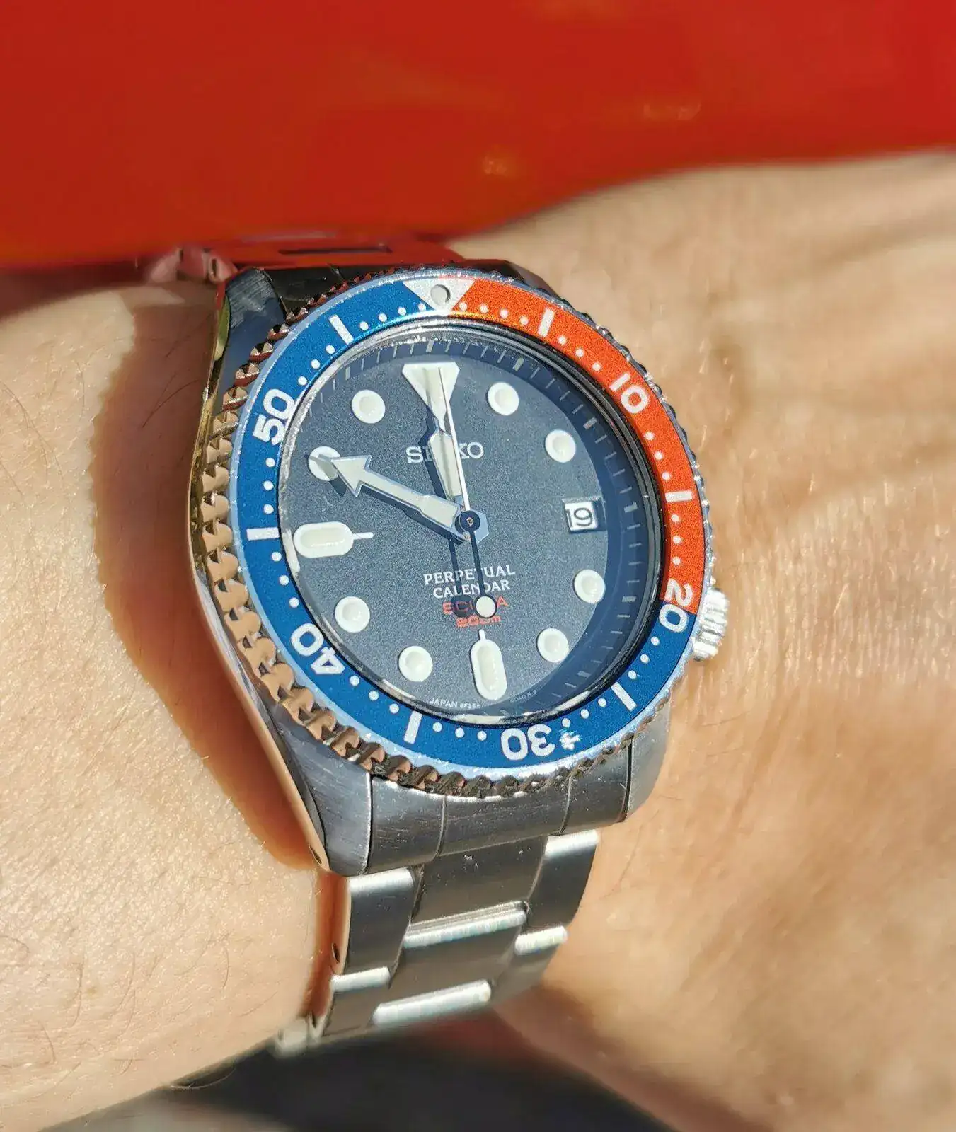 Pero indagando por esa línea descubrí que Seiko sacó a principios de los 2000s una línea de calibres, los 8F, que además de ser HAQ con una precisión de +-20s/a (y que en uso habitual al parecer resultaba mucho mejor, cercana a los +-5s/a en muchos casos), tenía una complicación de calendario perpetuo... Y los habían montado en una caja muy parecida a la del SKX013! Los SBCM023, 025 y 027. Negro, Pepsi y Naranja respectivamente.