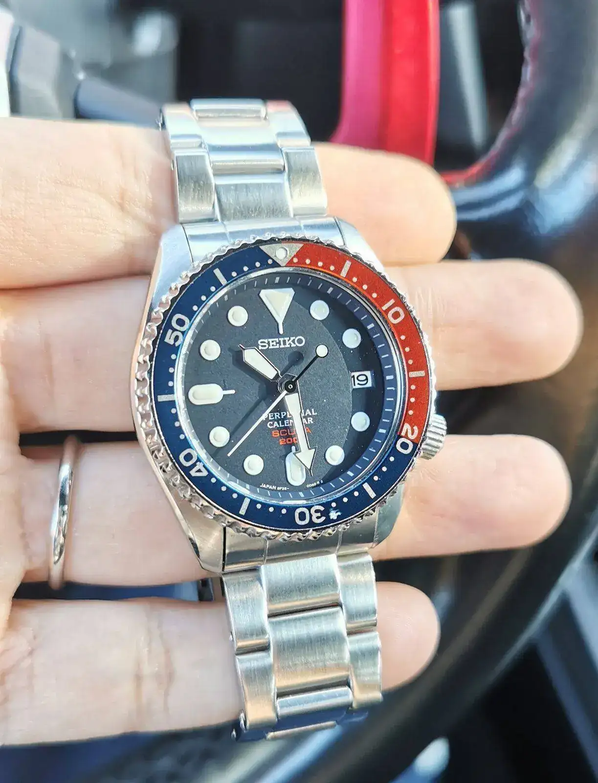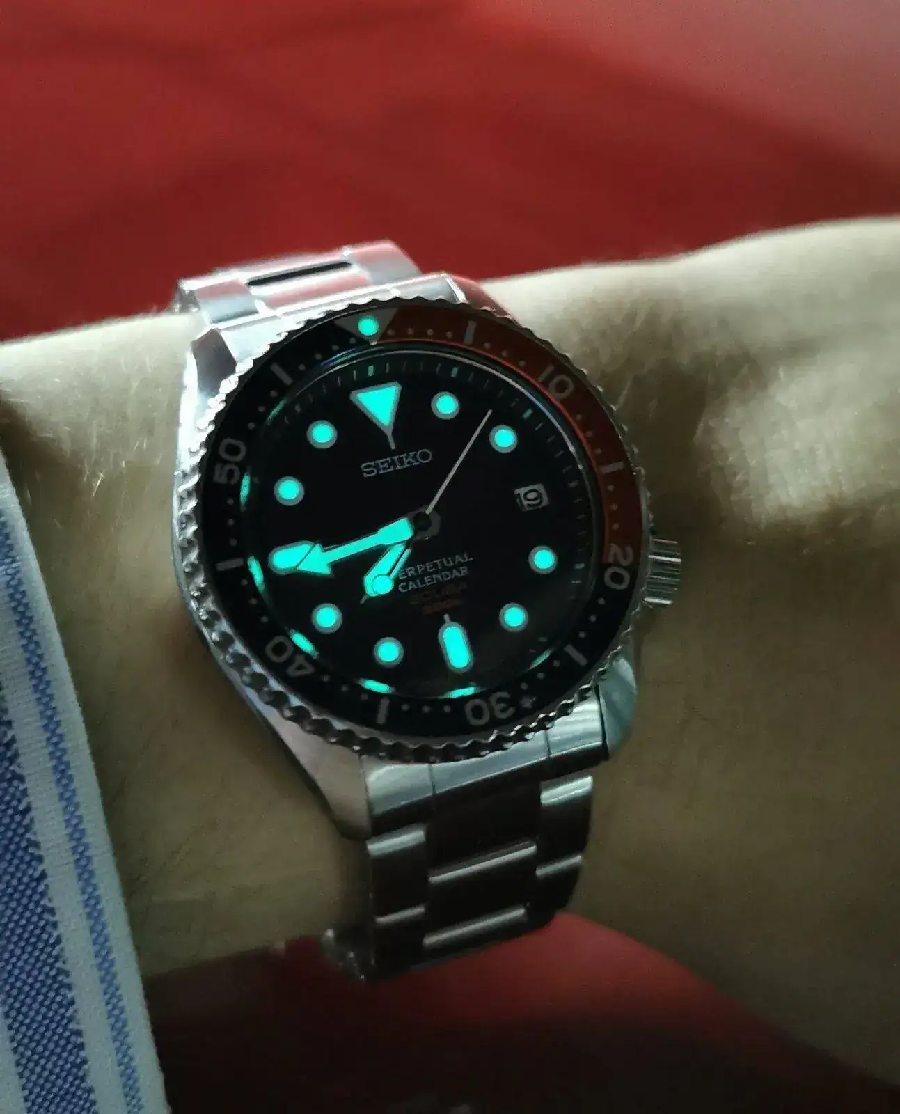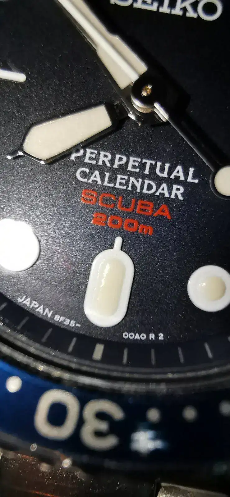 Pero indagando por esa línea descubrí que Seiko sacó a principios de los 2000s una línea de calibres, los 8F, que además de ser HAQ con una precisión de +-20s/a (y que en uso habitual al parecer resultaba mucho mejor, cercana a los +-5s/a en muchos casos), tenía una complicación de calendario perpetuo... Y los habían montado en una caja muy parecida a la del SKX013! Los SBCM023, 025 y 027. Negro, Pepsi y Naranja respectivamente.