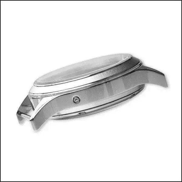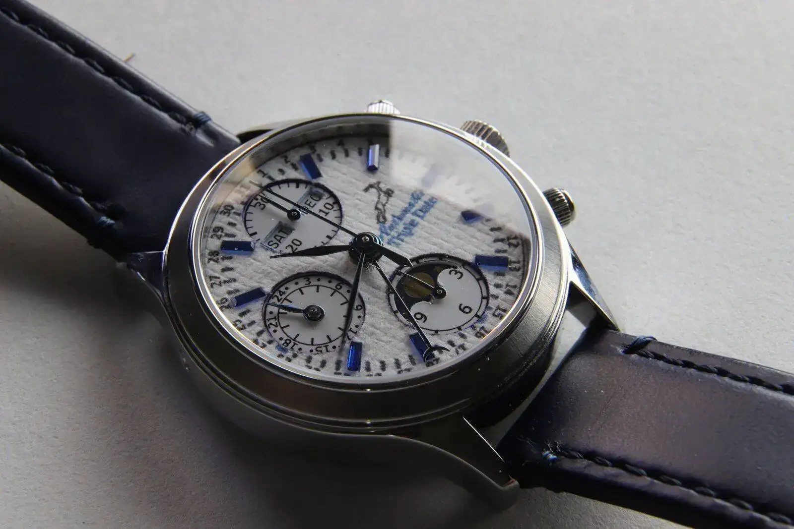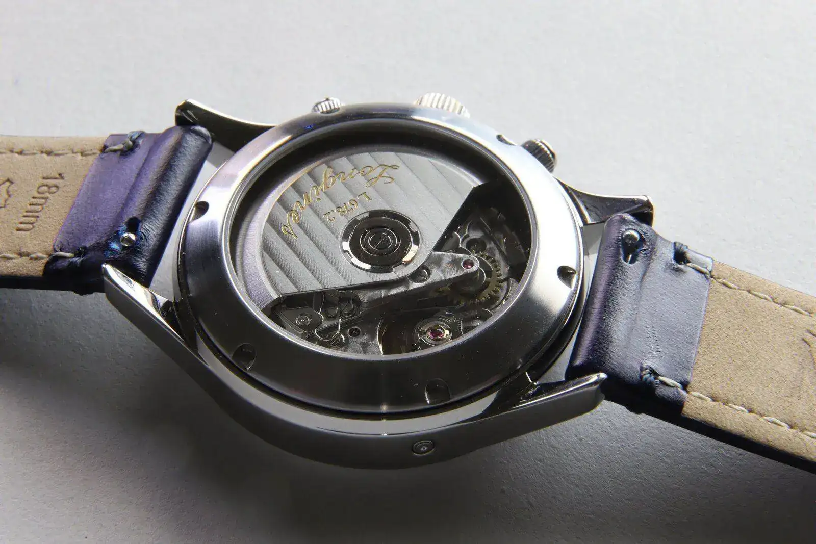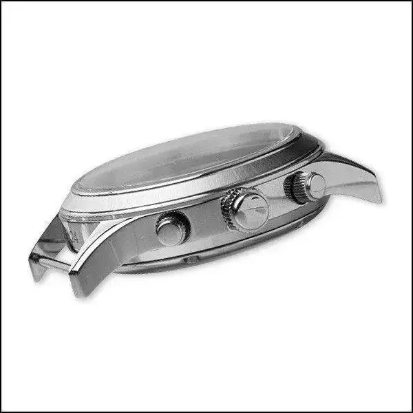 Caja de acero quirúrgico, como los legendarios Lanscotte, referente de diseño en todo momento a lo largo del proyecto. 37.5mm de diámetro, 45.5 entre asas, 13.5 de grosor, zafiro curvo con antirreflejante arriba y mineral abajo y unos escasos 50m de WR. Los 37.5 me acojonaban un poco porque pensé que serían algo escasos, pero por otro lado quería meter las más complicaciones posibles en la caja más pequeña que pudiera y el diseño que tenía en mente era bastante de vestir, lo cual iría bien con una caja de dimensiones reducidas. Lo más alucinante son los 13.5mm de grosor. Aunque la 7751 tiene el mismo grosor que una 7750, mi Carrera CV2010 mide 16mm enteros, con la misma curvatura en el cristal y el mismo WR...