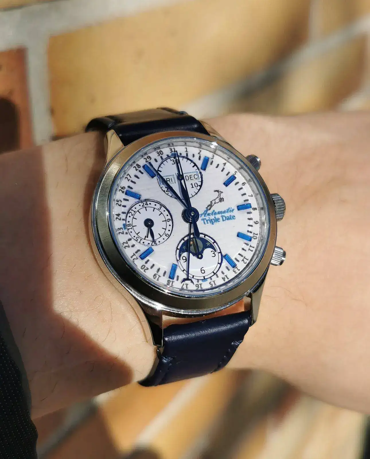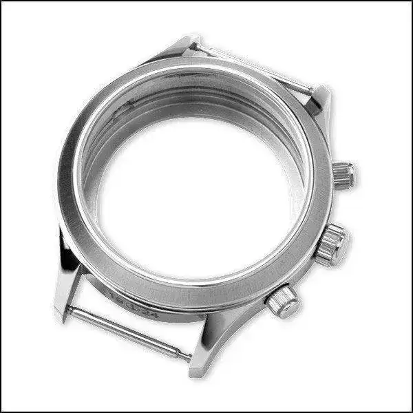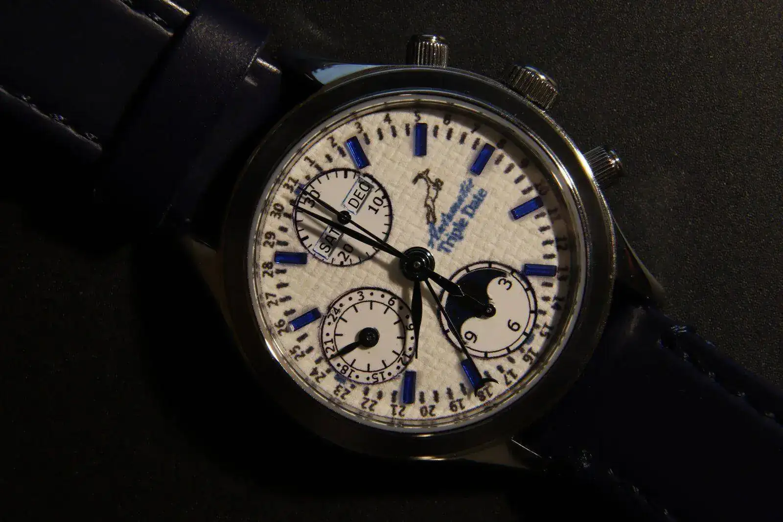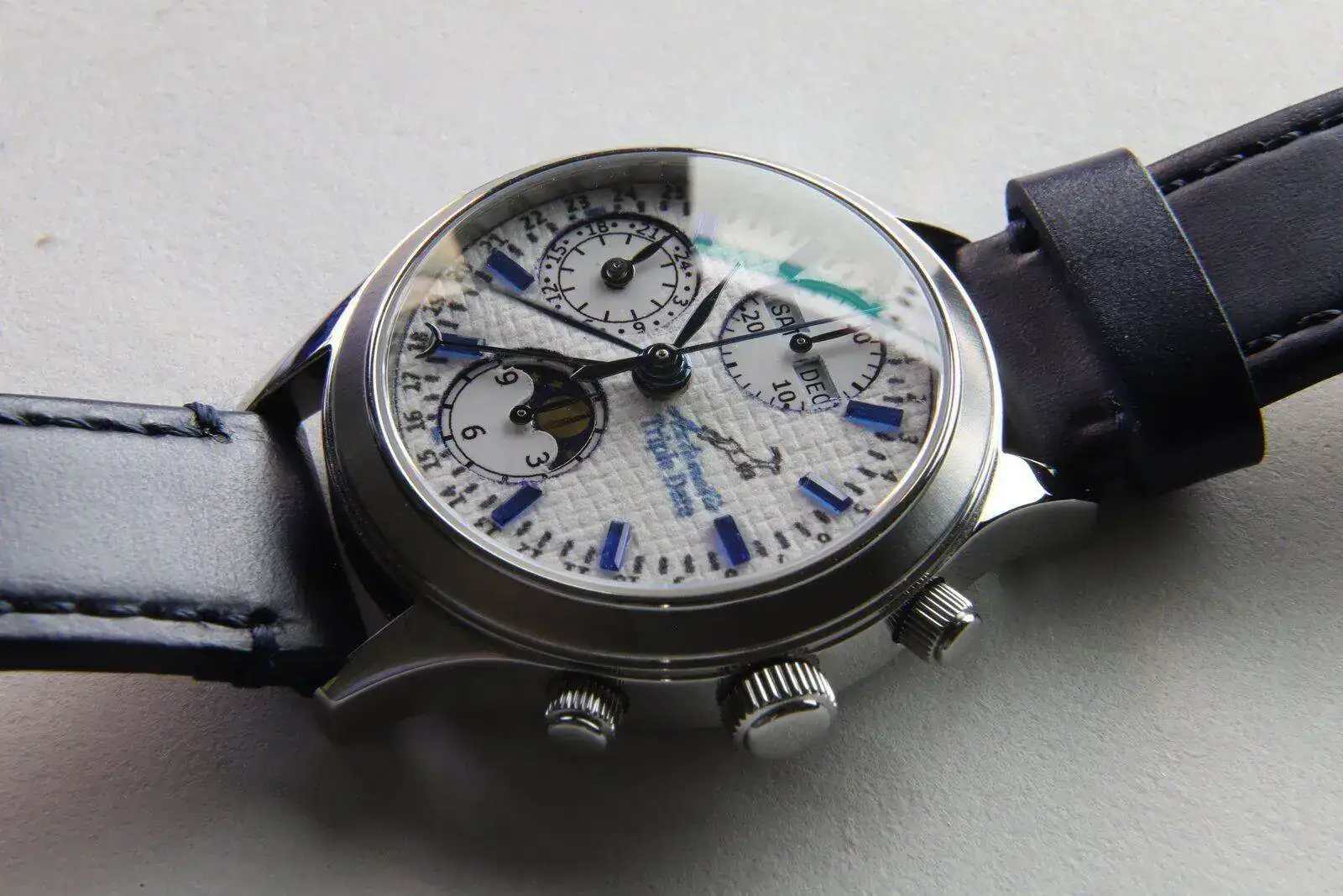 Caja de acero quirúrgico, como los legendarios Lanscotte, referente de diseño en todo momento a lo largo del proyecto. 37.5mm de diámetro, 45.5 entre asas, 13.5 de grosor, zafiro curvo con antirreflejante arriba y mineral abajo y unos escasos 50m de WR. Los 37.5 me acojonaban un poco porque pensé que serían algo escasos, pero por otro lado quería meter las más complicaciones posibles en la caja más pequeña que pudiera y el diseño que tenía en mente era bastante de vestir, lo cual iría bien con una caja de dimensiones reducidas. Lo más alucinante son los 13.5mm de grosor. Aunque la 7751 tiene el mismo grosor que una 7750, mi Carrera CV2010 mide 16mm enteros, con la misma curvatura en el cristal y el mismo WR...
