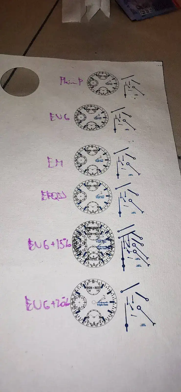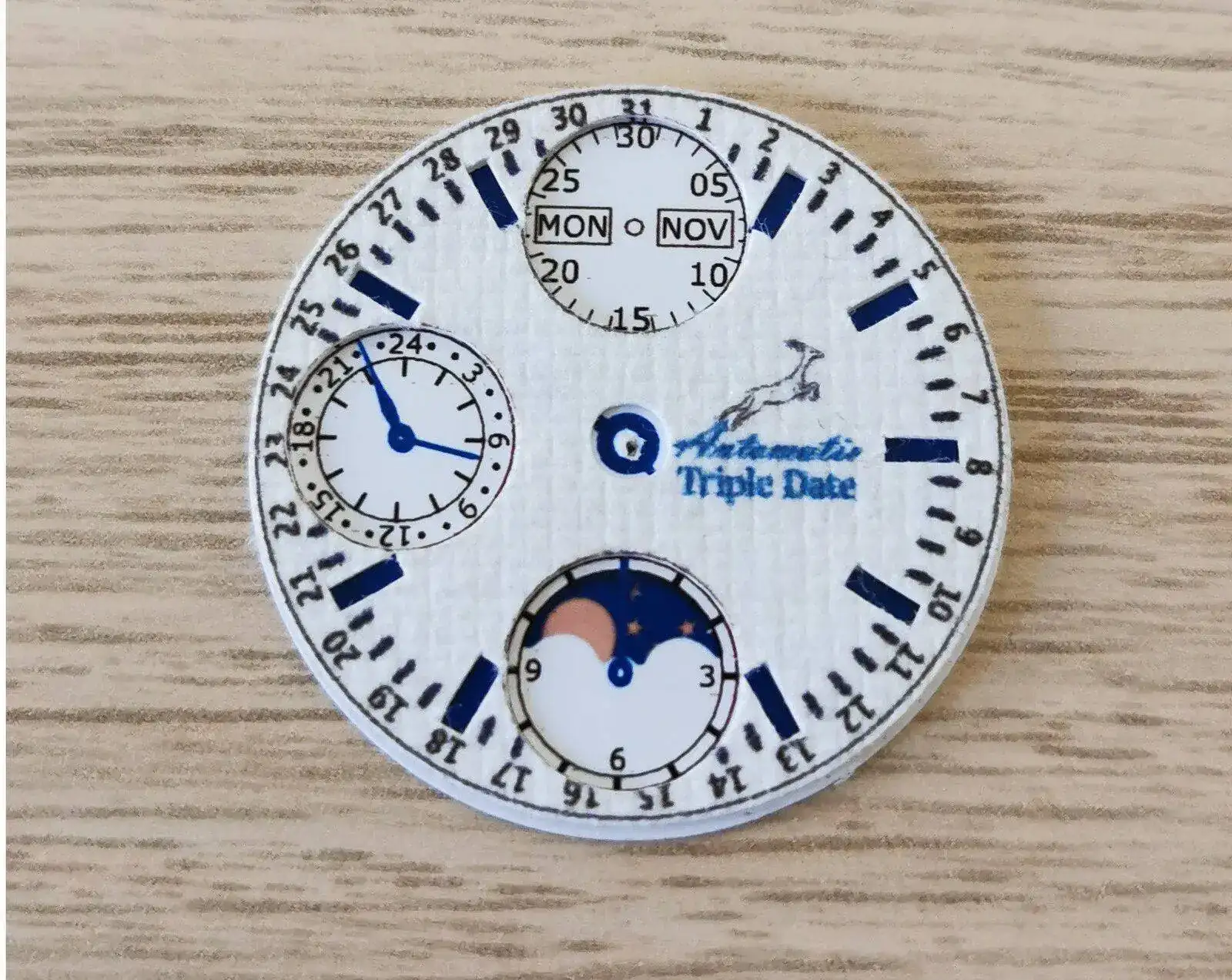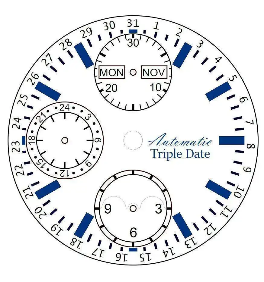 Con caja en mano y dimensiones apuntadas, tocaba ponerse a diseñar... Me inspiré bastante en el Longines Triple date, pero quise darle mi toque en la medida que me lo permitiese mi imaginación y mi escaso manejo del InkScape. Tras varias iteraciones, sabía que usaría el mismo método que para el Soprod, o sea impreso en papel, pero quería un papel con una textura guay, y fondo brillante para los subdiales. Acabé con este diseño que luego tuve que modificar porque se ve que en la ESO no aprendí la diferencia entre 8mm y 9mm... La distancia que hay entre los centros de los subdiales y el centro absoluto.