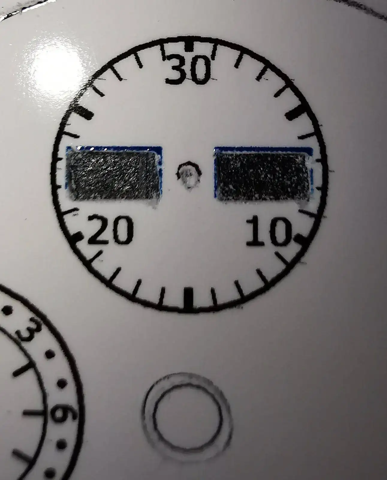 Una vez pegados, hacer unos rebajes en la parte posterior para que los dial dots (puntitos adhesivos de doble cara) que uso para fijar los diales al movimiento no le añadan grosor, poner los dial dots y fijar al movimiento: