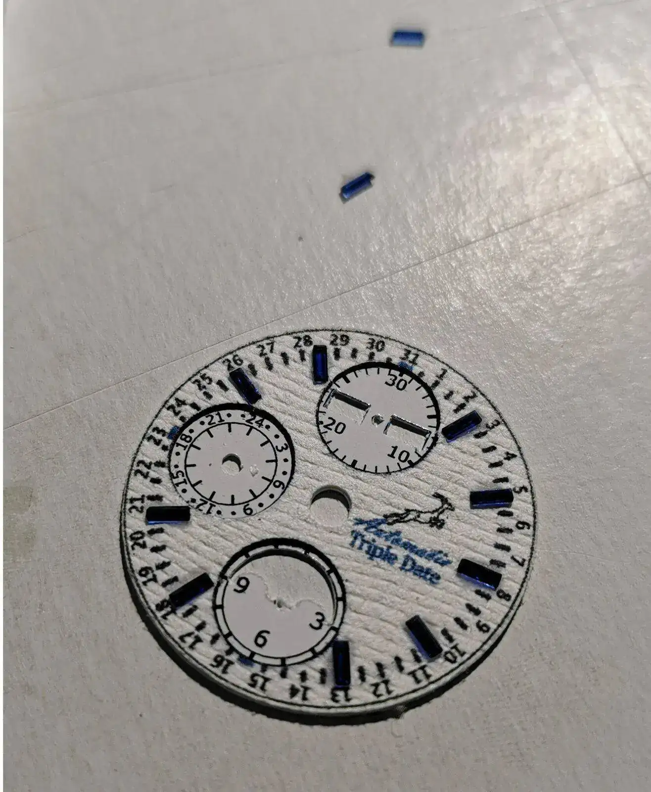 Finalmente, conseguí un resultado aceptable al ojo desnudo y a una distancia normal de vista de un reloj. No aguanta ni de lejos una lupa ni unas fotos con macro, como veréis luego, pero que se le va a hacer. Tengo una impresora, un ploter de corte y un ordenador. Si tuviera una fresadora CNC y una máquina de tampografía intentaría vivir de esto...