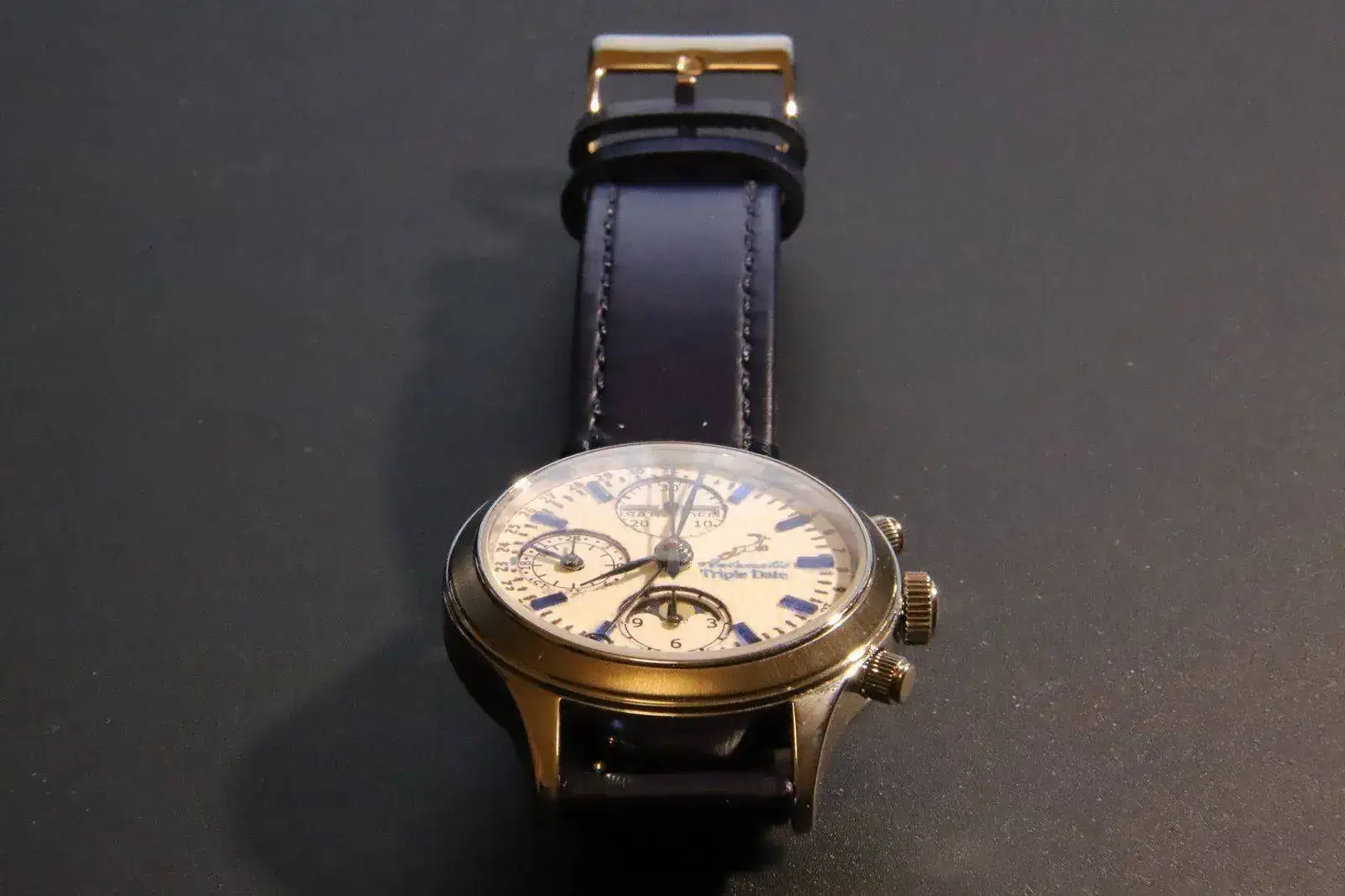 Cuando metí el movimiento, y le di la vuelta a la caja casi me da algo de la emoción. Era mejor aún de lo que había imaginado durante casi 5 meses!!! Presa de la emoción, corté la tija, cerré la caja, monté la correa y me lo puse. Al accionar el crono me di cuenta de que el crono no corría y el reloj se paraba. Aguja del segundero del crono demasiado larga y que pegaba con el cristal... Volver a abrir, cortar la aguja, doblarla un pelo hacia abajo y TERMINADO!