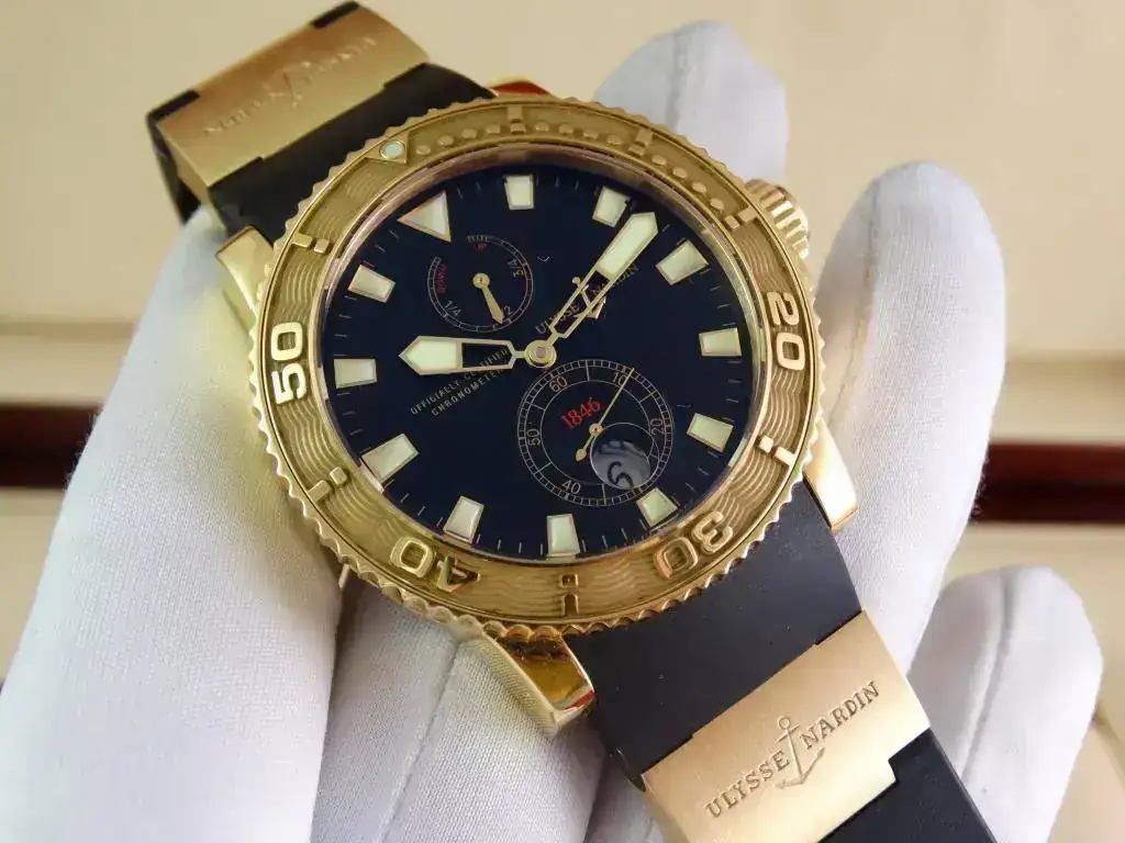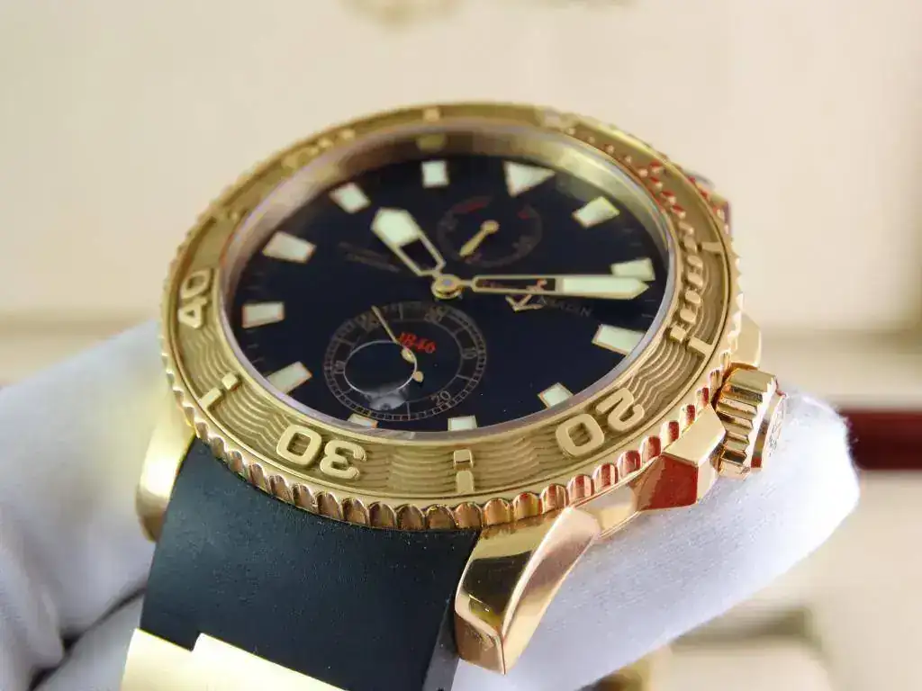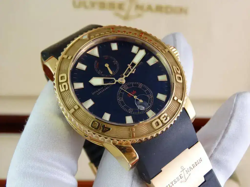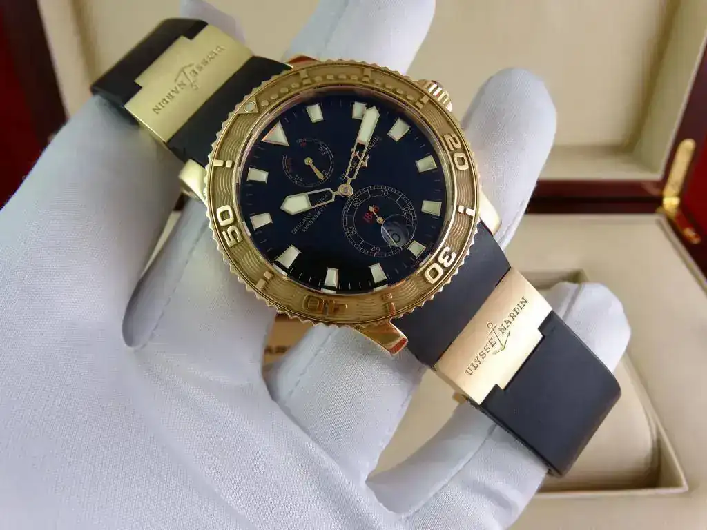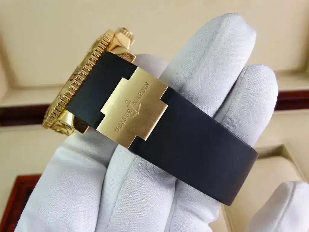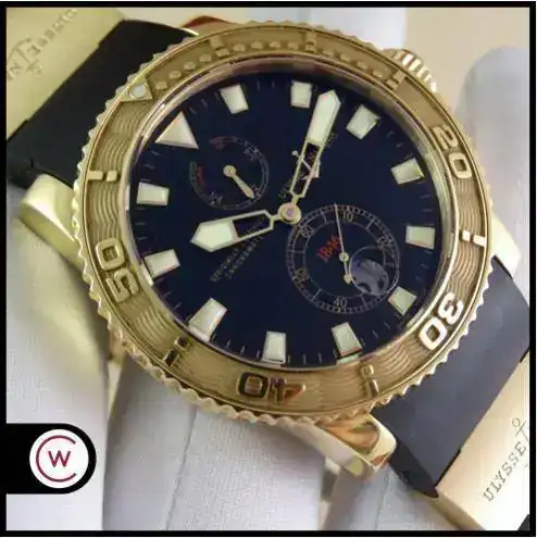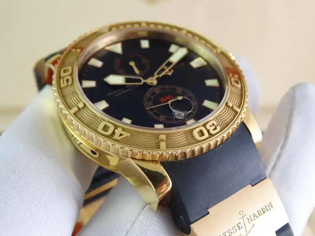 En muchas ocasiones nos encontramos con la dificultad de aunar la elegancia del oro y la deportividad en una misma pieza, pues Ulysse Nardin ha sabido conjugar ambas características en una misma, ofreciendo un reloj deportivo de estética Diver, de la linea Maxi Marine, con una caja de oro amarillo de 18k, rematado con una increíblemente cómoda correa de caucho con deployante doble; un conjunto totalmente acertado y equilibrado que a pesar del peso del oro y de su tamaño, resulta cómodo y muy fácil de llevar, elegante, deportivo, llamativo en su justa medida pero discreto para miradas curiosas, en resumen, un reloj a la altura de las expectativas y totalmente polivalente.