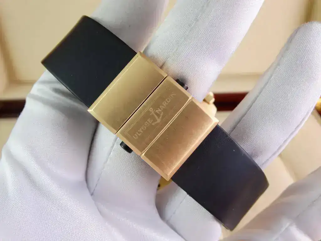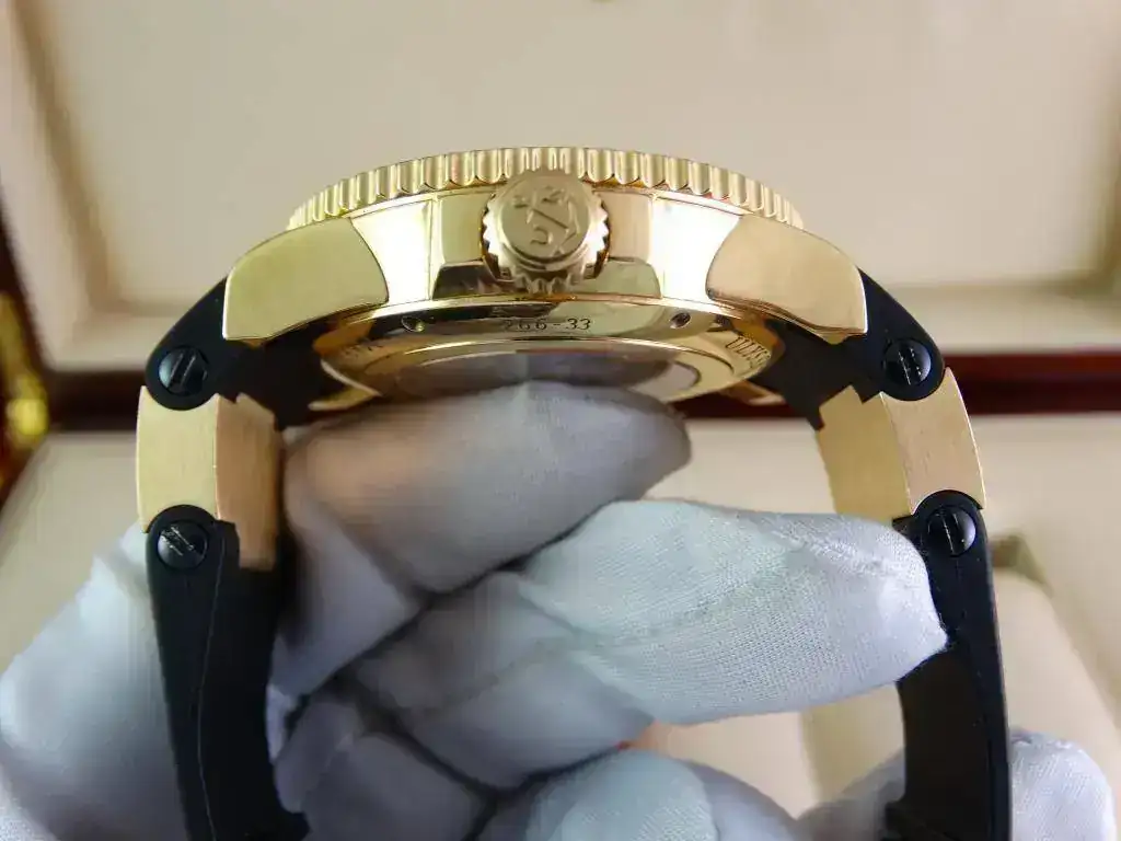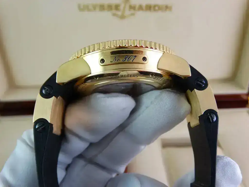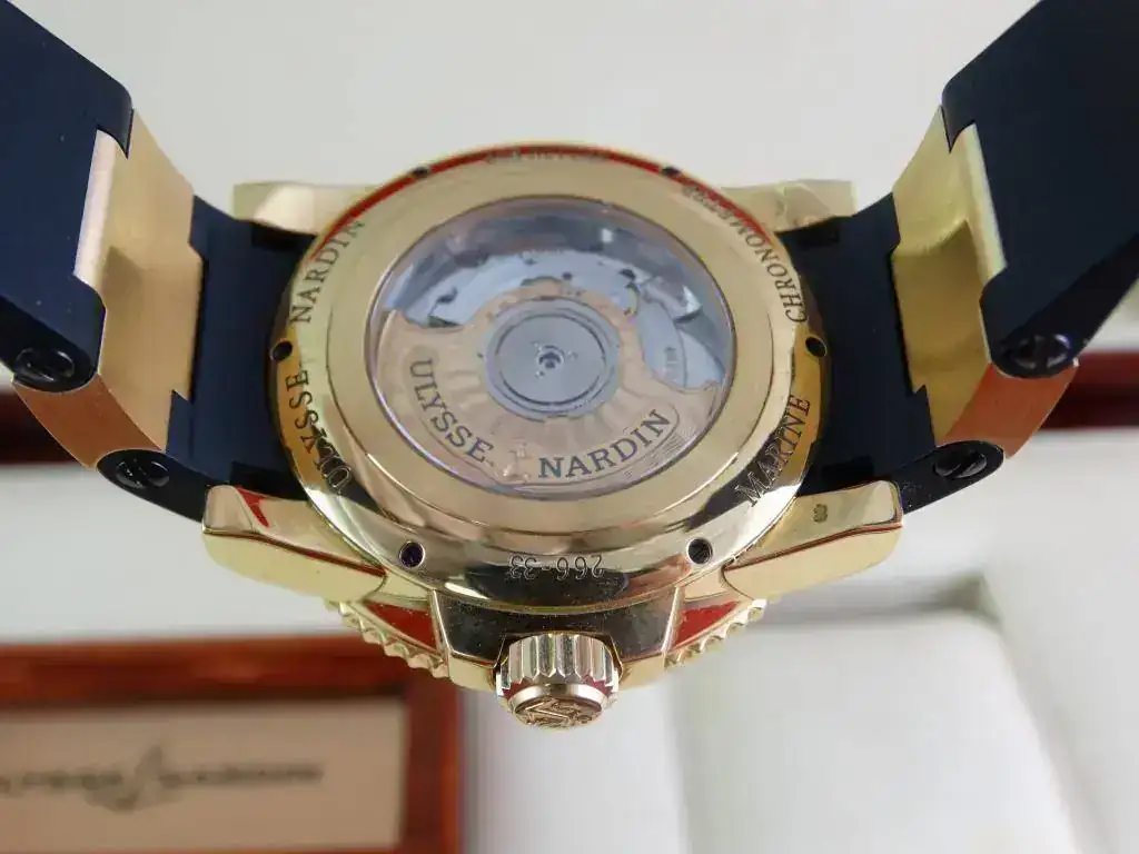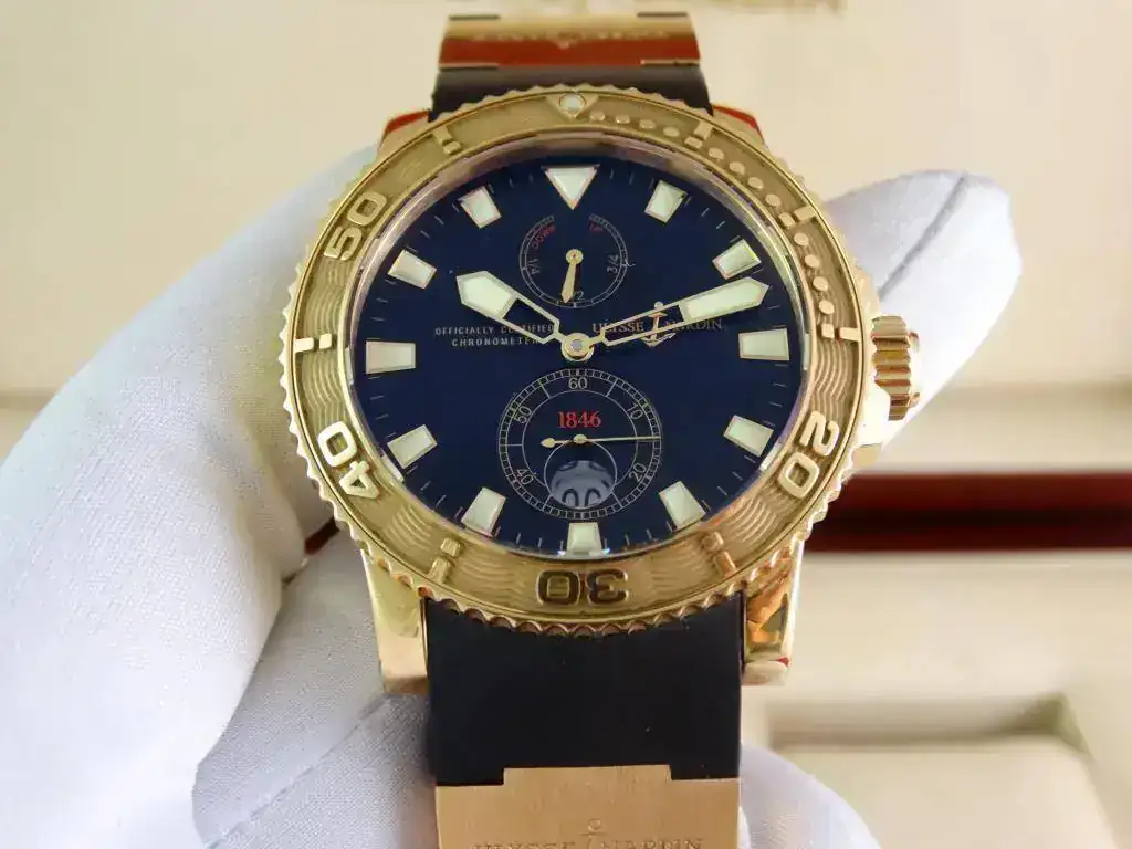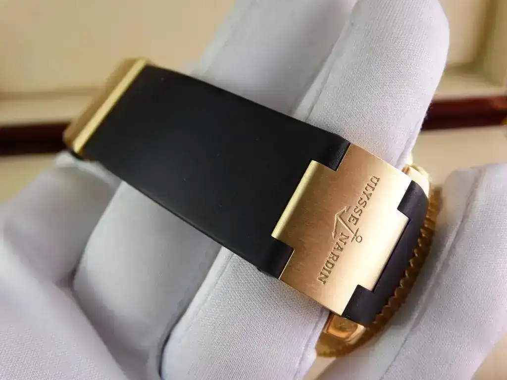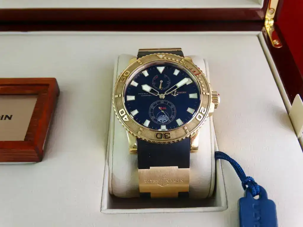 En muchas ocasiones nos encontramos con la dificultad de aunar la elegancia del oro y la deportividad en una misma pieza, pues Ulysse Nardin ha sabido conjugar ambas características en una misma, ofreciendo un reloj deportivo de estética Diver, de la linea Maxi Marine, con una caja de oro amarillo de 18k, rematado con una increíblemente cómoda correa de caucho con deployante doble; un conjunto totalmente acertado y equilibrado que a pesar del peso del oro y de su tamaño, resulta cómodo y muy fácil de llevar, elegante, deportivo, llamativo en su justa medida pero discreto para miradas curiosas, en resumen, un reloj a la altura de las expectativas y totalmente polivalente.