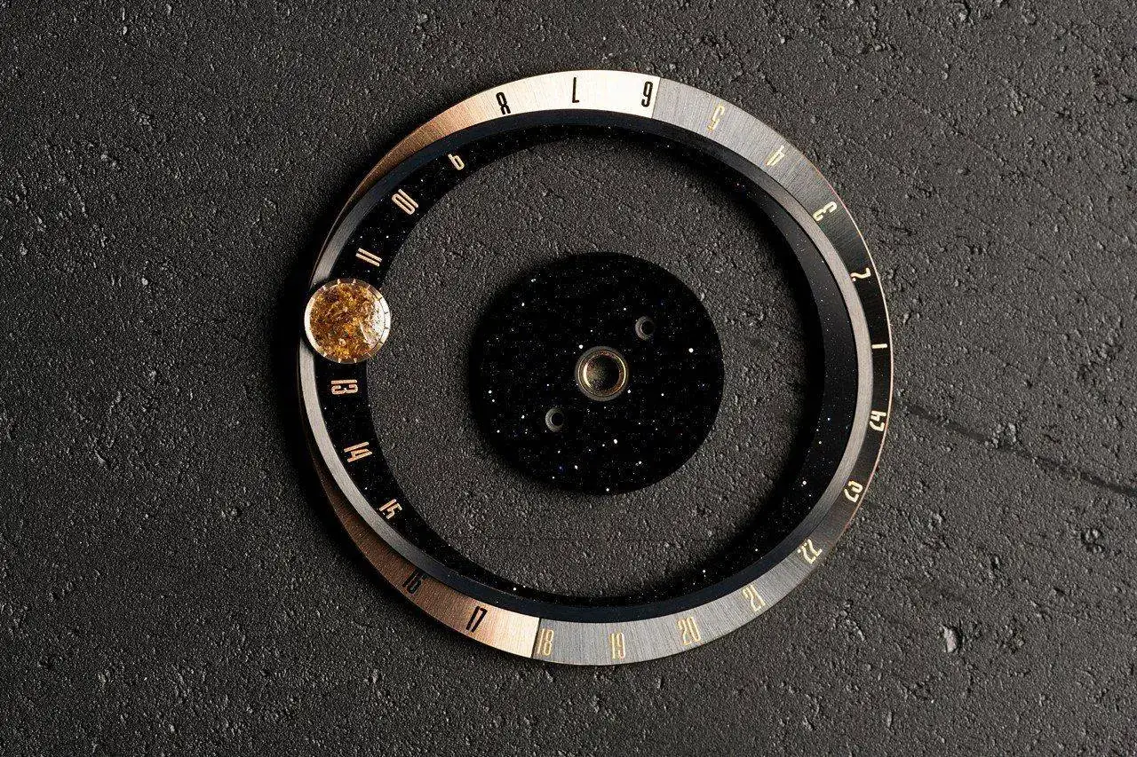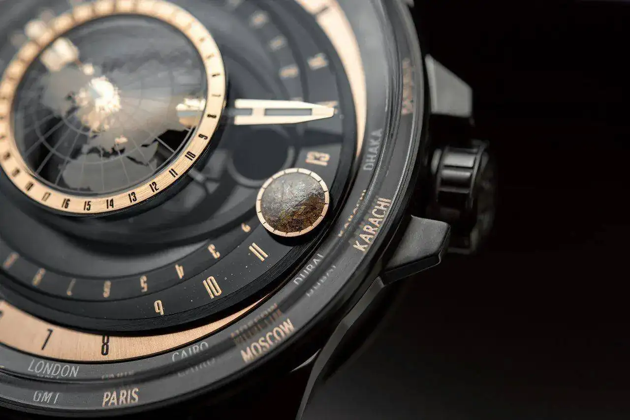 Para acentual la sensación de estar en el centro del Universo a partir de la observación del reloj, se ha colocado la parte del hemisferio norte vista desde el Polo Norte en el centro del cristal de zafiro. Para aumentar el impacto del efecto 3D, el cristal abovedado, con las masas terrestres grabadas en miniatura en el interior, está fijado a la caja protectora de cristal de zafiro rodeada por un anillo de oro rosa de 18 quilates grabado con los 31 días del mes, que tiene por puntero un pequeño triángulo cargado de materia luminiscente.