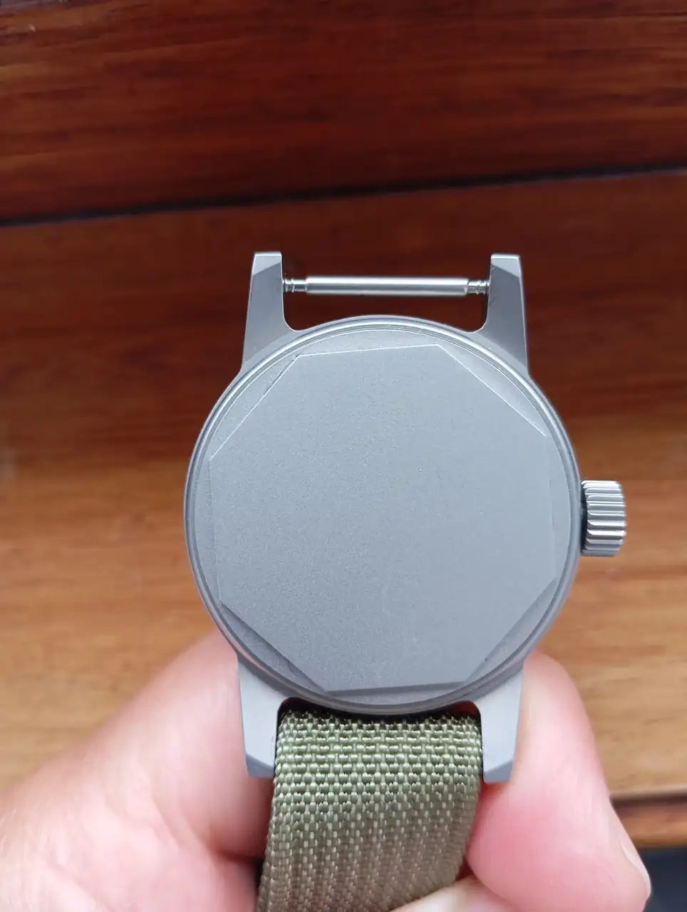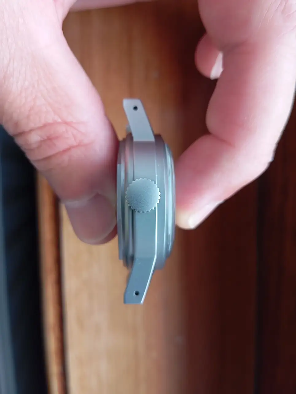 La caja está muy bien acabada. Es de acero 316L con chorro de arena. La corona tiene muy buen tacto y el cristal es Plexi abombado que le da calidez.