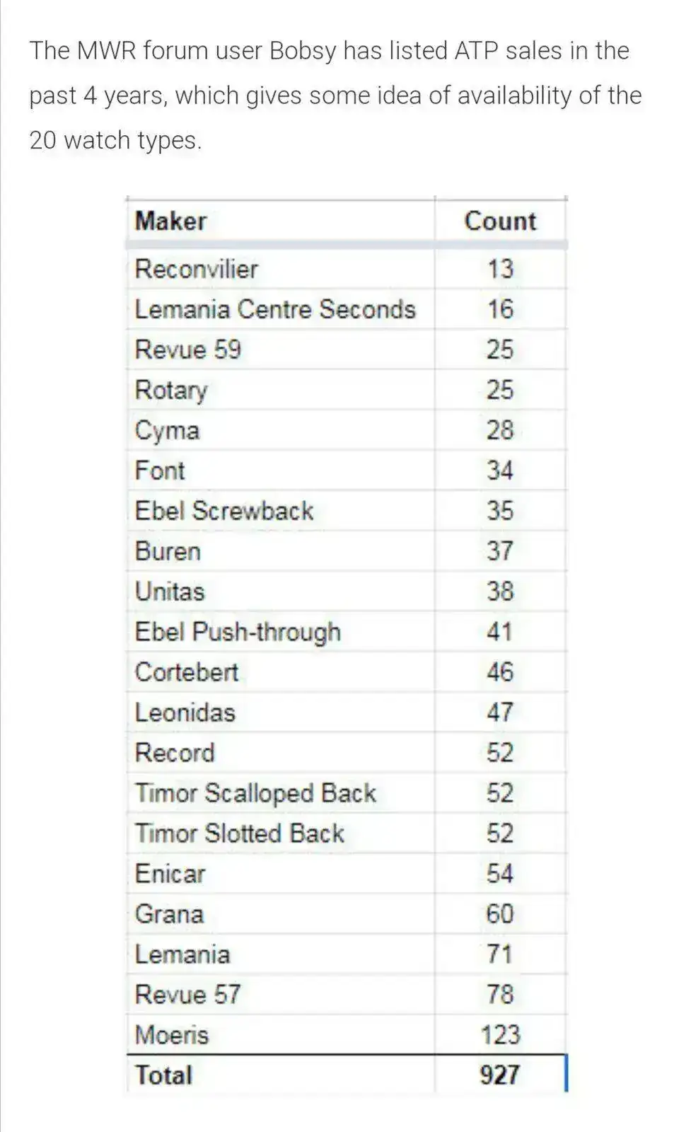 Ahora bien, como en todo, hubo excepciones que incluso fueron acentuándose con el paso de años de servicio y fabricación, y que hacen que hoy día, en ocasiones, sea un auténtico laberinto su identificación. Sin detenernos en ellas, son por ejemplo, el empleo de algún rubí más en el calibre, caso de uno de los Enicar. Pasadores normales, caso de Leónidas, Font o Buren. Segundero grande, caso de uno de los Lemania. Dial estéril, caso de algún Record y Ebel. Caja de acero inoxidable, caso del Cyma y Ebel. Caja de 29mm de diámetro, caso de Cyma. Dial negro, caso de uno de los Eterna.