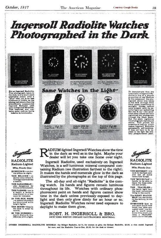 Las necesidades de la guerra van enaumento. El bajo costo de producción de los relojes Ingersoll haceque su producción se dispare. Cuando Estados Unidos entra en elconflicto en 1917 ya hace dos años que exportan sus relojes a laguerra. La US Radium Corporation, se encarga de pintar con radio yasí hacer visibles en la oscuridad las manecillas y los numerales delos relojes fabricados para la guerra por Ingersoll.