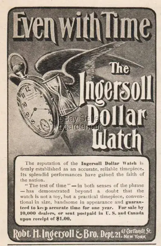 Todo empezó en 1880 cuando los hermanos Robert y Charles Henry Ingersoll(3), tuvieron la brillante idea de diseñar un reloj de bajo costo, dirigido a gran parte de la población norteamericana, que no podía permitirse el lujo de poseer un reloj. Este proyecto que inspiraría más tarde a Henry Ford, se presentó en la feria mundial de Chicago de 1883. El coste total de fabricación, como indica su nombre fue de un dólar. Si nos atendemos que a principios del SXX un trabajador no cualificado, ganaba unos 25 centavos de dólar al día por una agotadora jornada laboral y el coste medio de un reloj era de 50$ ya nos podemos imaginar el éxito sin precedentes que supuso esta empresa.