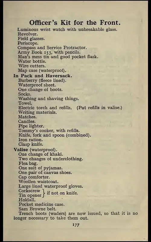 Si mis fuentes no me traicionan(12), fue el primer reloj militar fabricado por encargo del ejército, en la fábrica de Waterbury, aunque como hemos visto anteriormente ya fue utilizado por oficiales britanicos(13) en los tristes episodios de los tanques. Eso supuso un aumento exponencial de la producción y si habéis leído con atención, siempre me he referido a “oficiales” como los “tenedores” de relojes. Con la entrada masiva en acción del Ingersoll, la cosa cambió y fueron muchos los soldados rasos, que debido a su bajo coste, lo pudieron utilizar. Aquí vemos el Kit básico para la guerra que debían llevar los oficiales (el reloj de pulsera, aparece en el primer lugar de la lista)