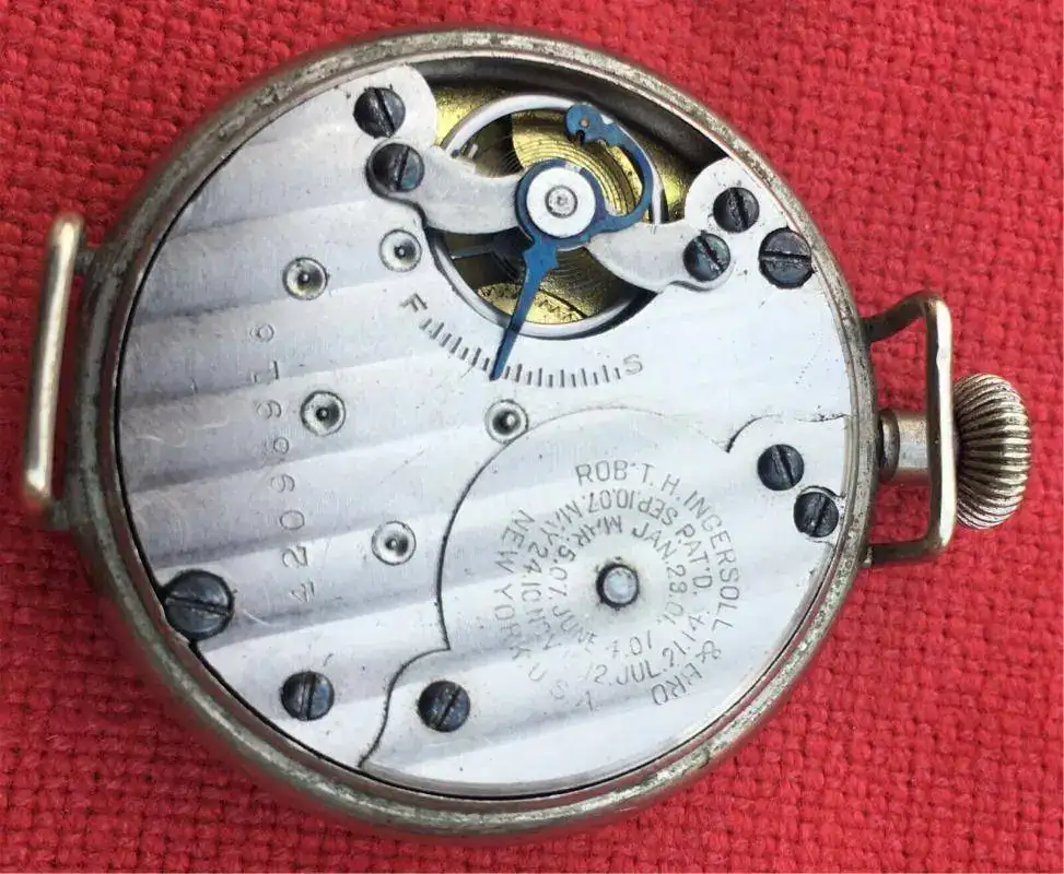 Su calibre, patentado por Ingersoll, es obviamente sin rubíes y con el escape de clavijas; Si bien es cierto que estos calibres no eran tan precisos ni tan resistentes al desgaste provocado en sus ejes, no dejaban de ser instrumentos de precisión y también robustos. Aquí su calibre y una imagen del sistema de escape de clavijas (6)