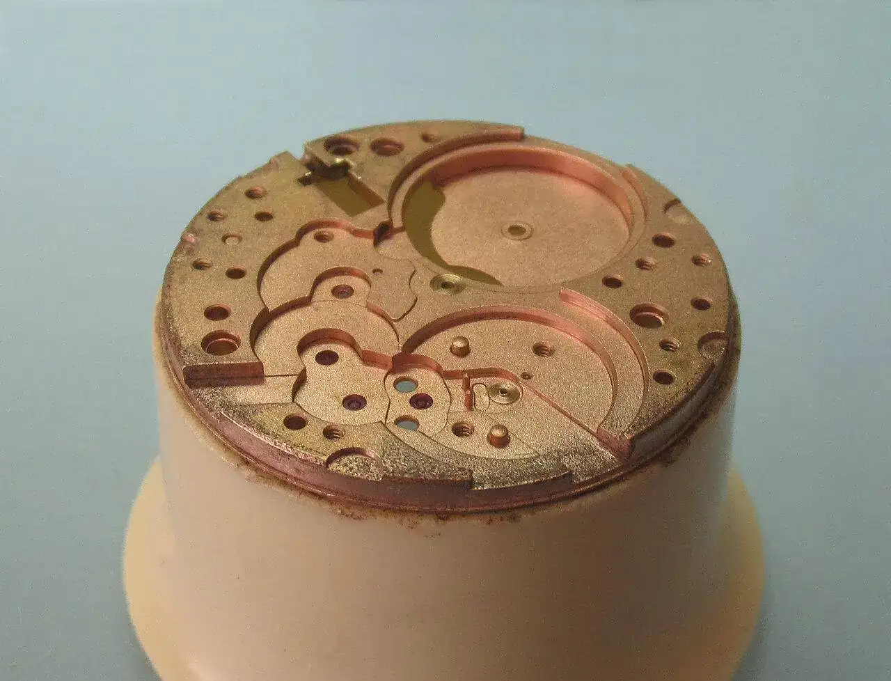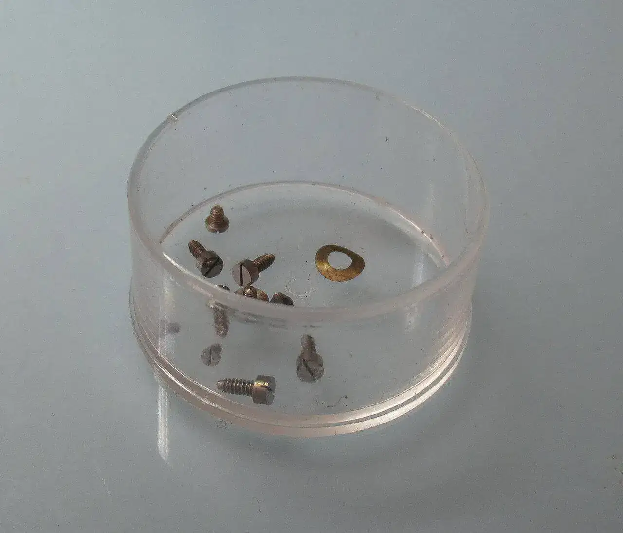 Hago otra excepción con este movimiento: no uso la cubitera, primero porque la tengo ocupada y segundo porque como también todos los tornillos son grandes y muy bien diferenciados no me hace falta. Así que todo el pequeño material a una cajita. Lo dorado es el talco, tallón o arandela de oropel.