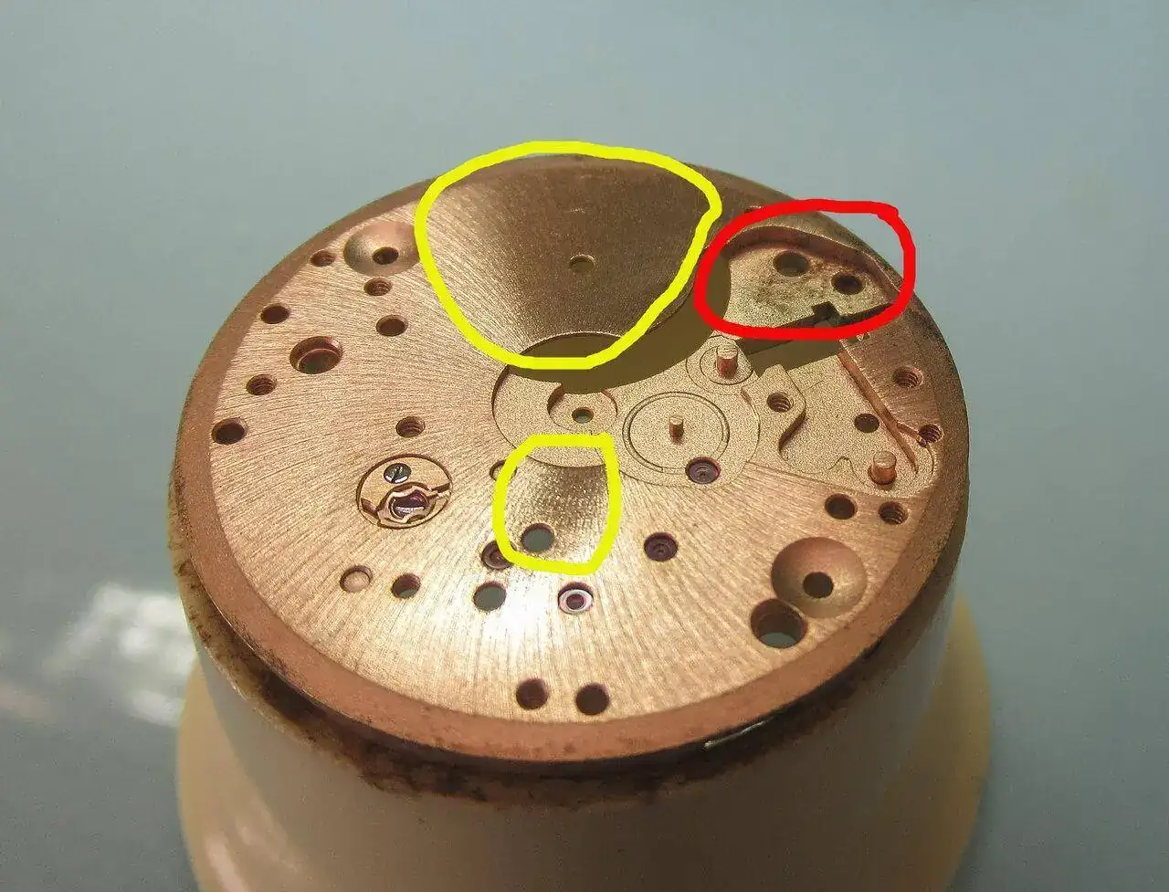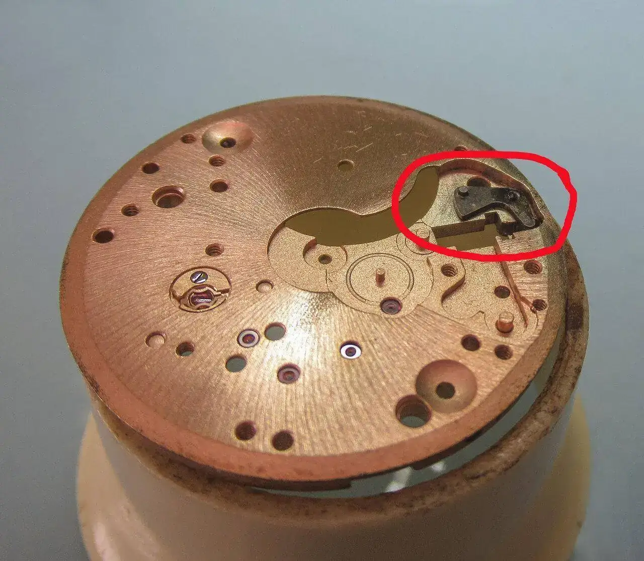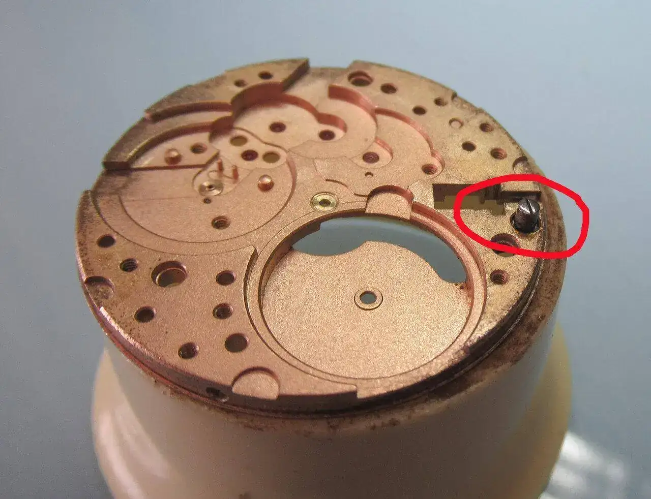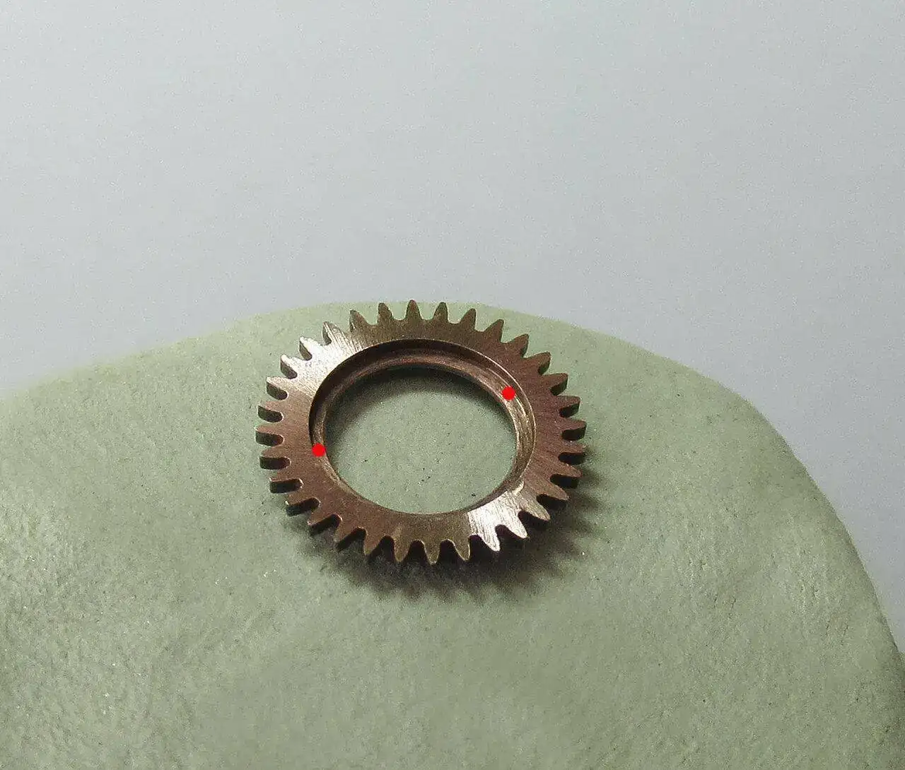 Para poner el cañón de minutos yo quito el conjunto de la virola y lo apoyo directamente contra el cristal: hay que hacer bastante fuerza y se podría doblar el puente de carga si estuviera en el aire. Es ese que tiene el punto rojo y en él va clavada la aguja de minutos