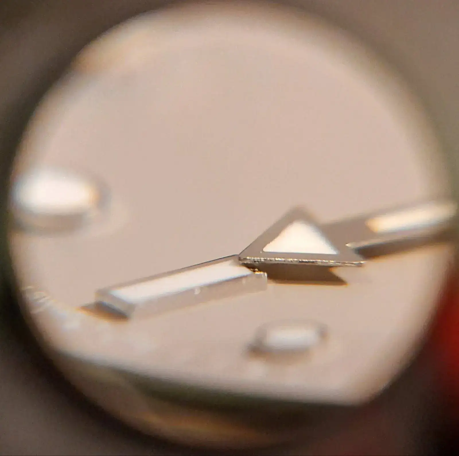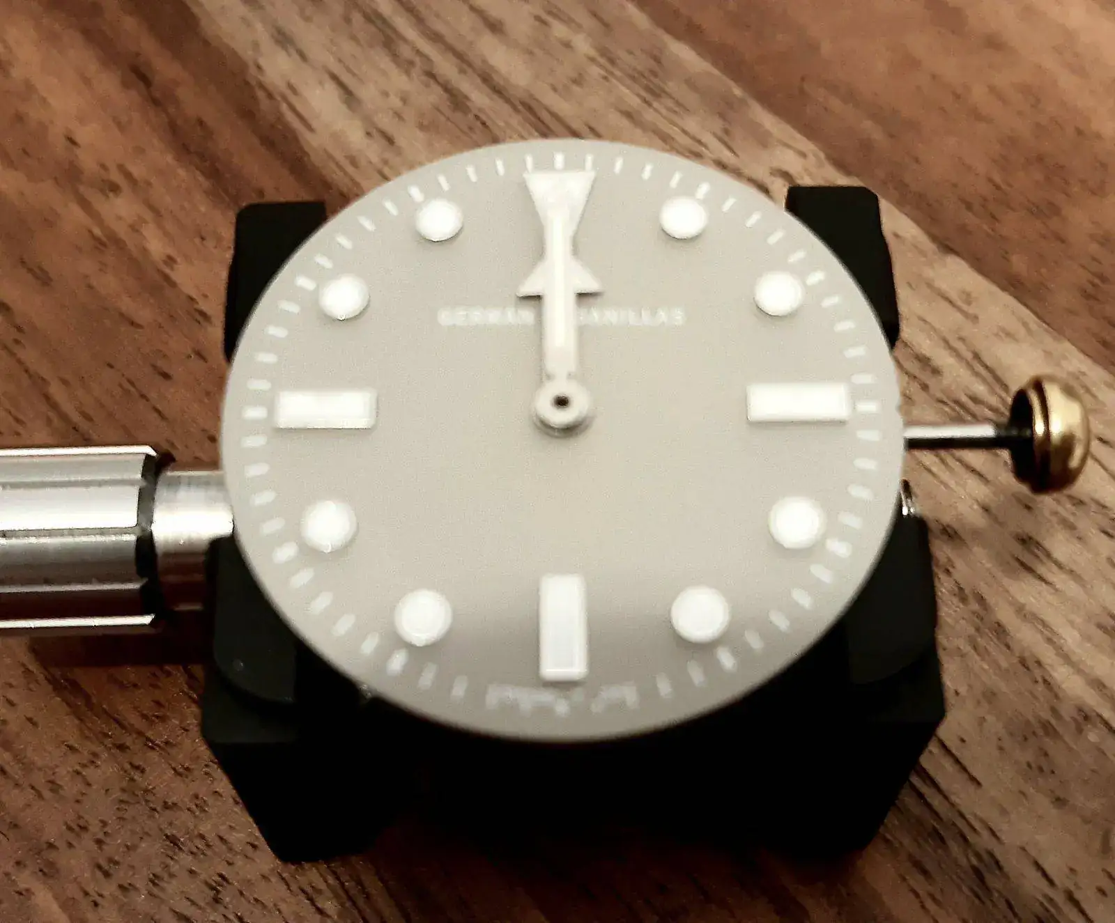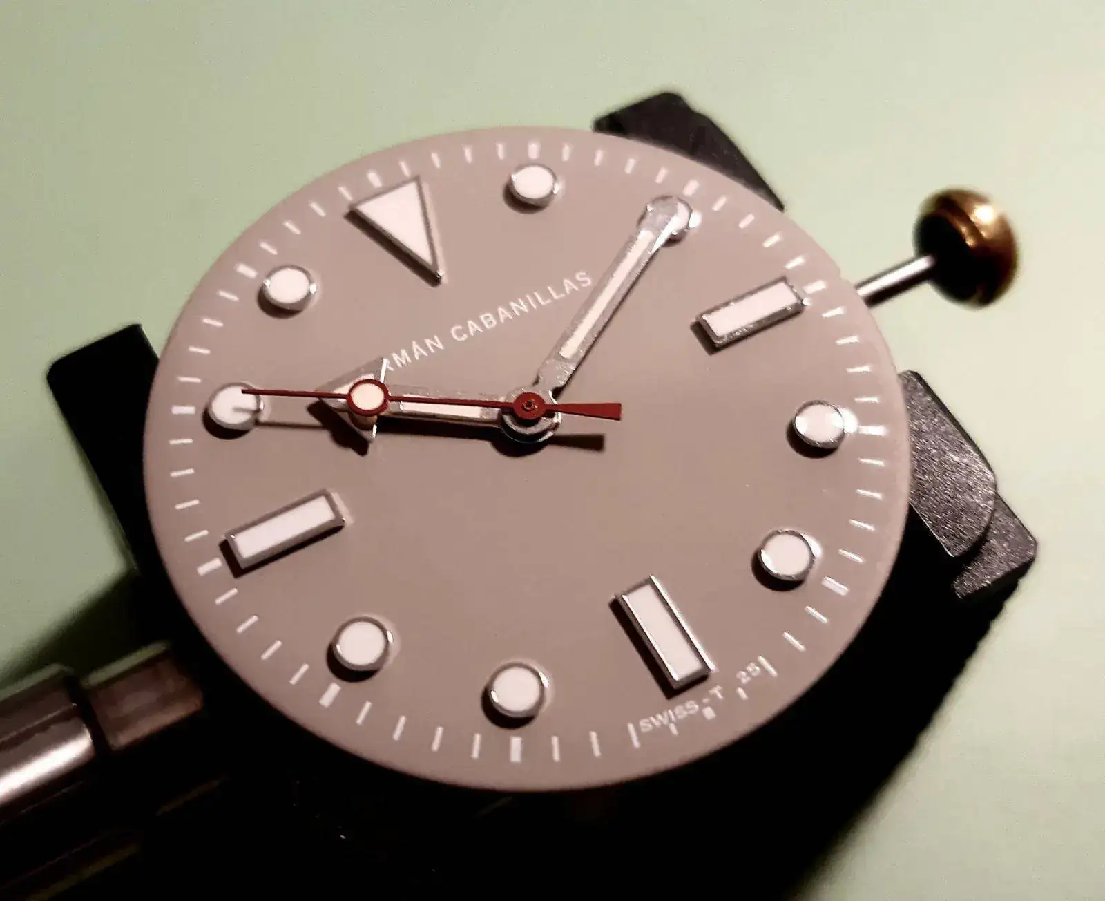 Ahora la esfera, que tiene los índices sobre elevados y hay que hilar muy fino con la aguja horaria. Lo suyo habría sido cambiar el movimiento por uno sin la altura extra del fechador. Pero no tenía ninguno a mano. Bueno, al limite: