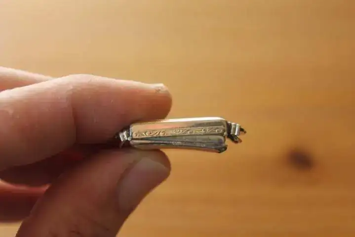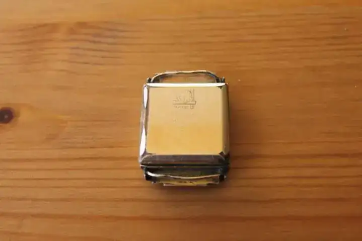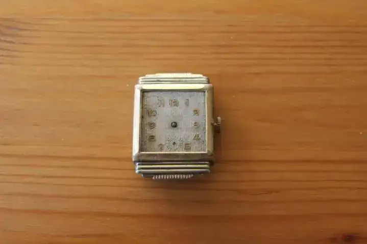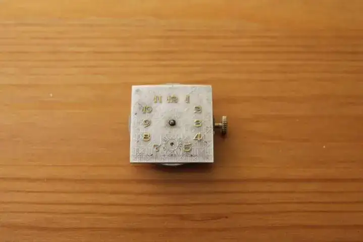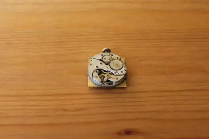 Las agujas completamente oxidadas, la caja apenas conserva la mitad del chapado original, y el eje del volante, roto.