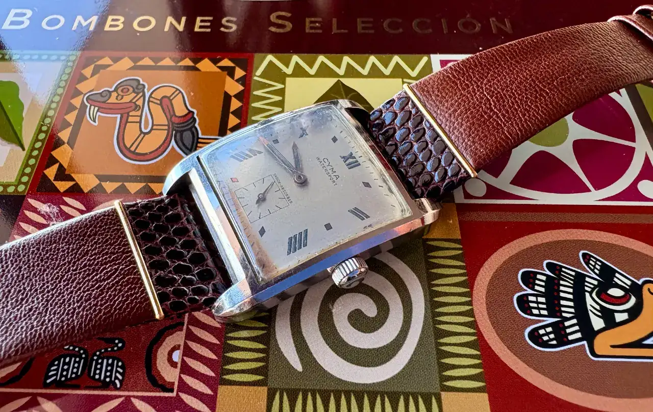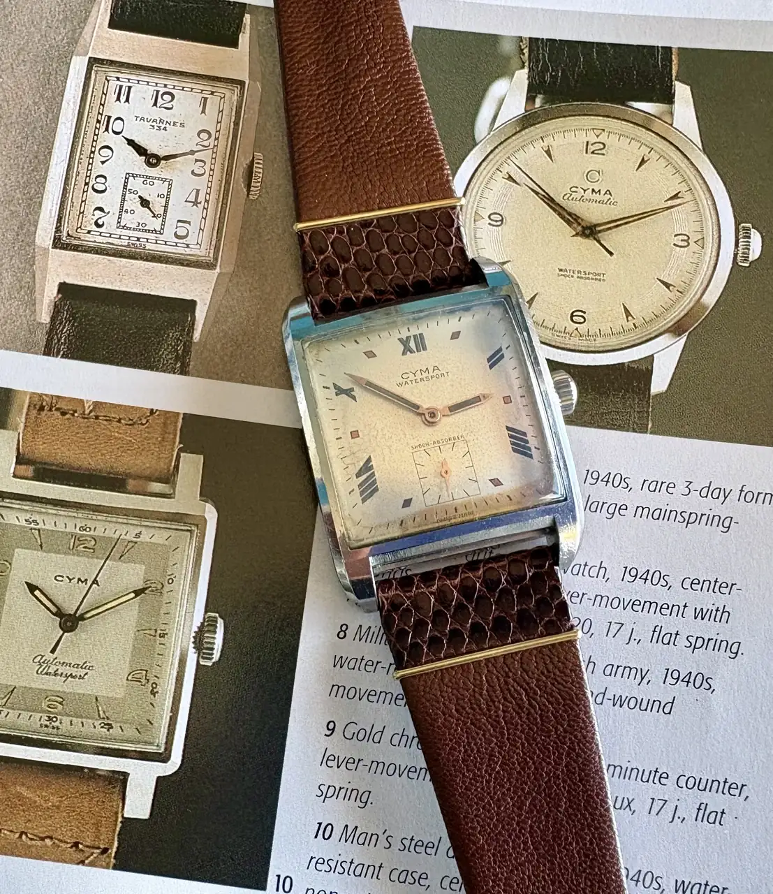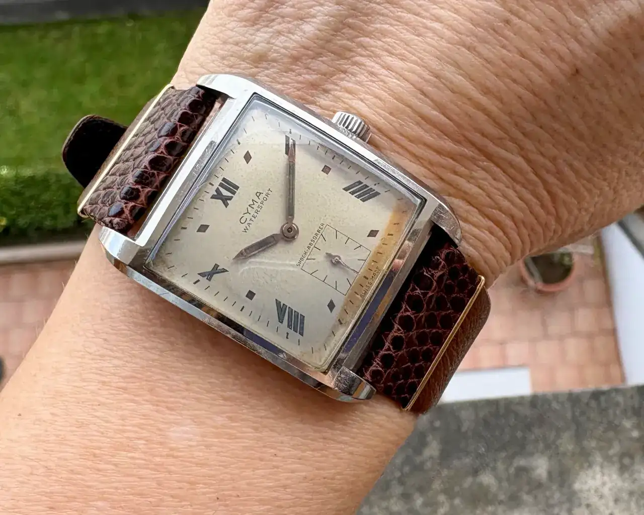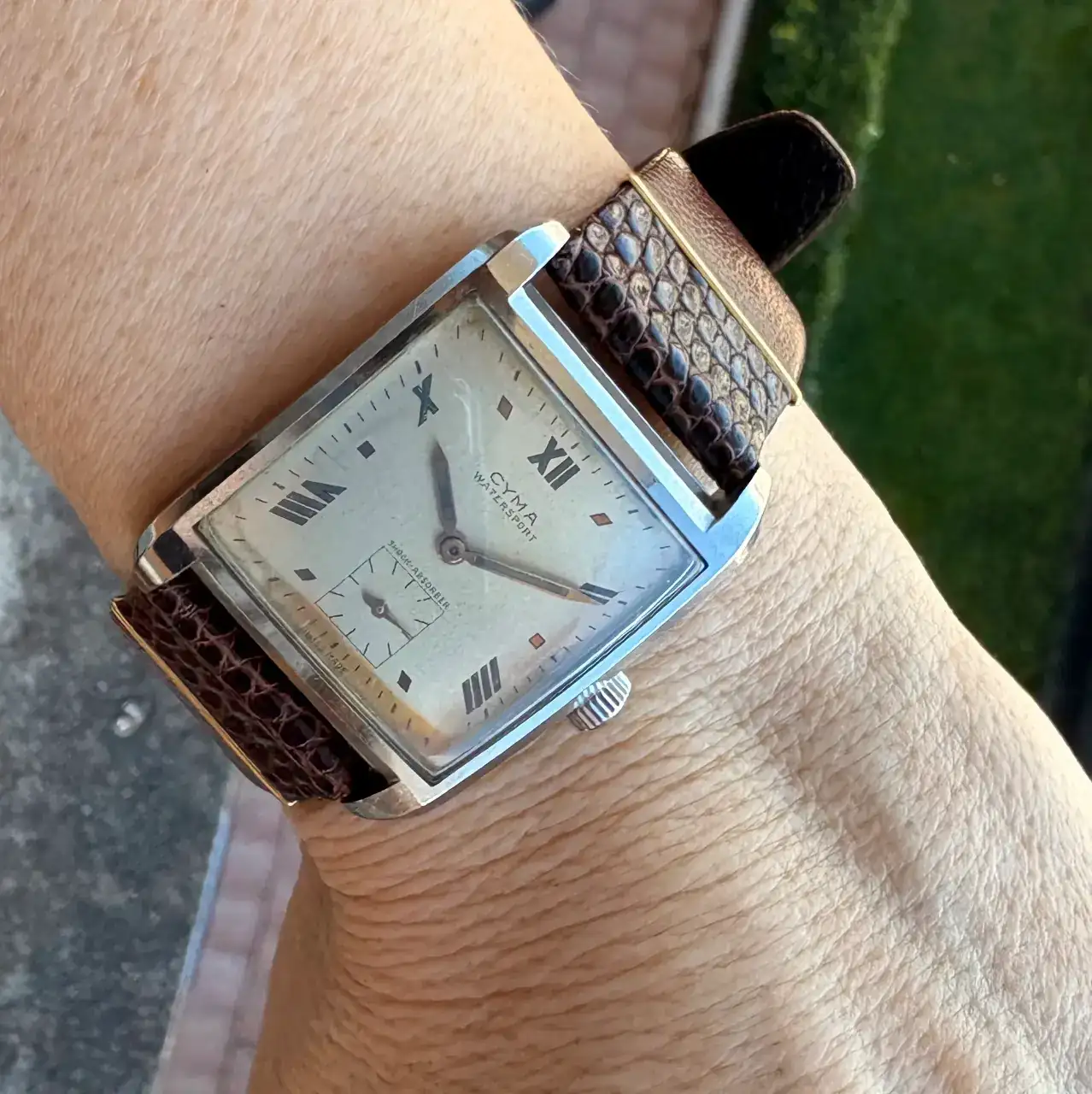 Los modelos “Watersport” a principios de la década de 1940 sucedieron a los “shock-proof” incorporando un extra de protección en los todavía vulnerables relojes de pulsera, en este caso frente a la humedad. Y a esta ilustre familia es a la que pertenece el bombón cuadradito que nos ocupa hoy 😍