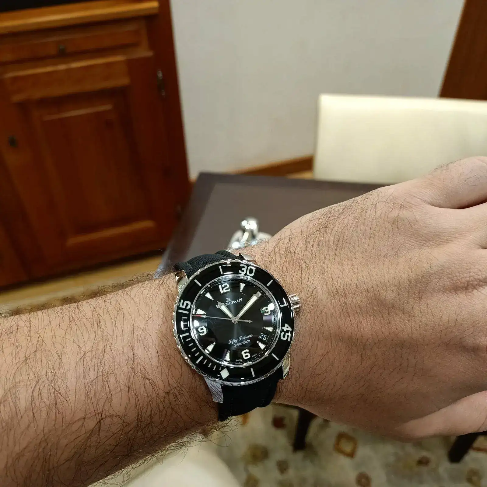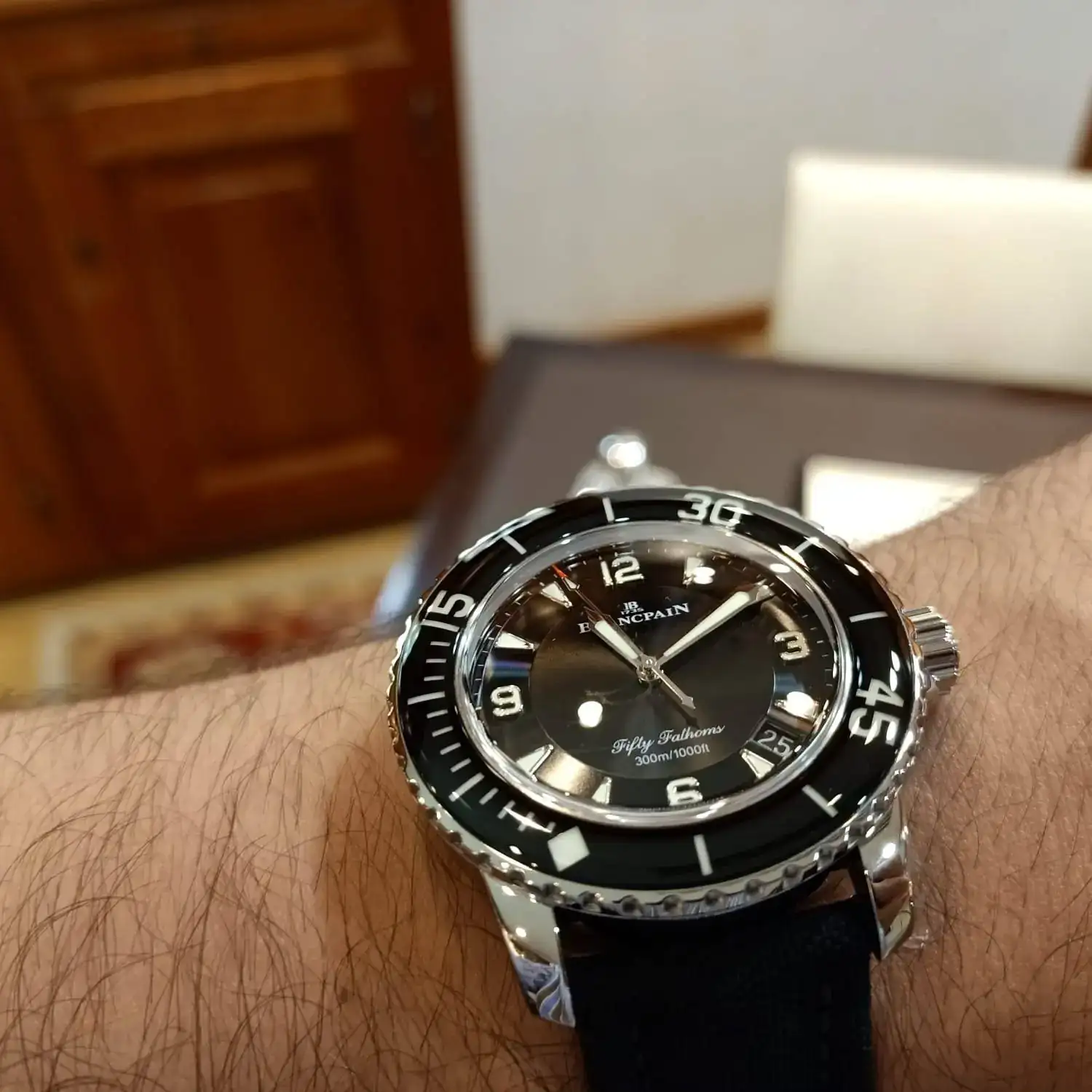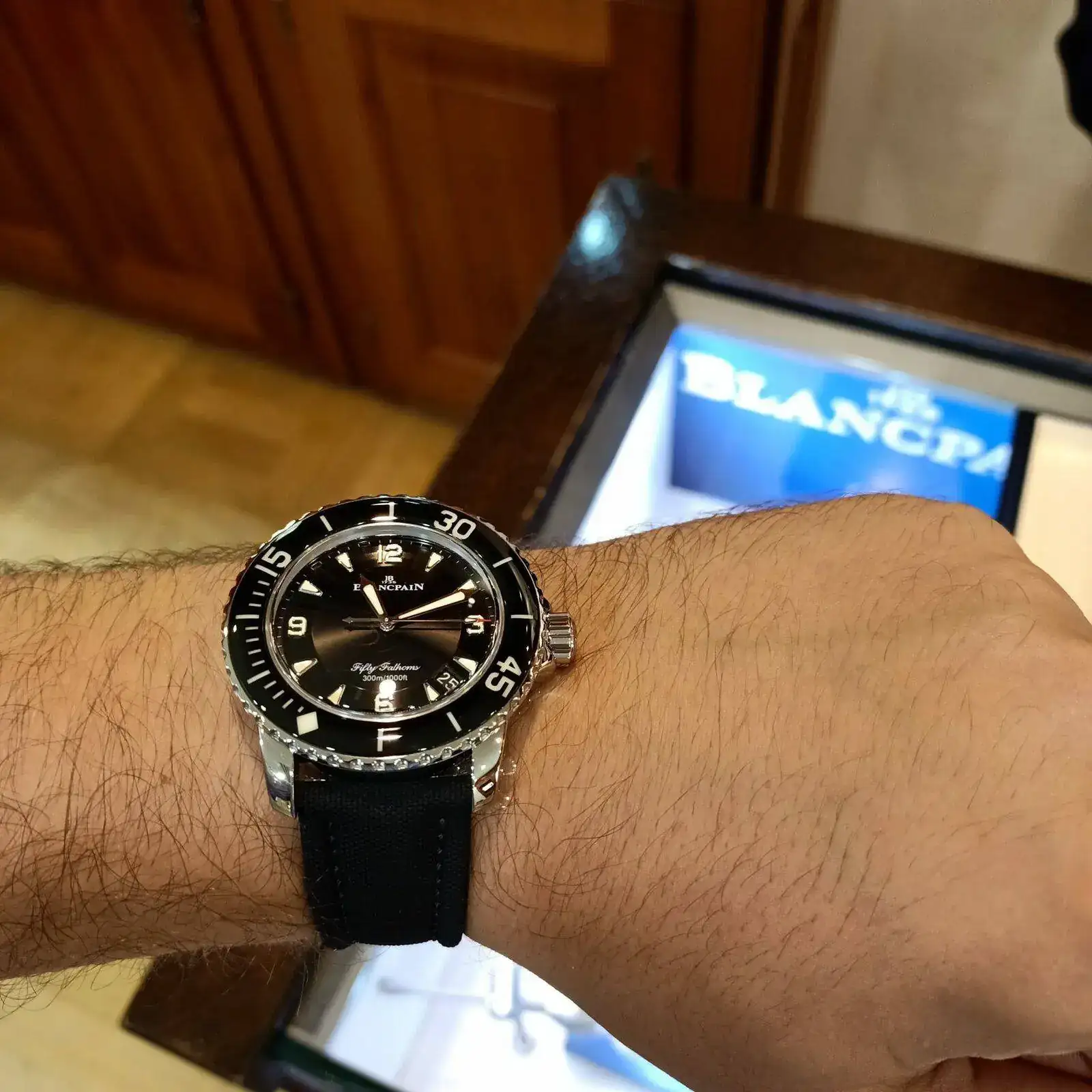 una pena vaya ...Decido entrar en Blancpain, y me atendió Andrés, un chico muy majo que antes trabajaba en el Glashütte del mismo ELCI pero que por la culpa de la pandemia parece que cerraron también. Me enseña amablemente casi todos los bathyscape que tenían en la Boutique y ya por último decido probarme el Fifty Fathoms Automatique de 45 mm, Negro y en acero: