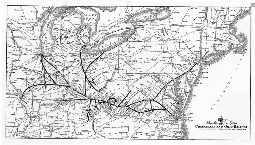 El ferrocarril de Chesapeake y Ohio (C&O) era un ferrocarril de clase I formado en 1869 en Virginia de muchos ferrocarriles más pequeños comenzados en el siglo 19. Aprovechando las reservas de carbón de Virginia Occidental, sirvió de base para el City of Newport News y los muelles de carbón de Hampton Roads, y forjó un enlace ferroviario con el Medio Oeste, llegando a Columbus, Cincinnati y Toledo en Ohio y Chicago, Illinois.