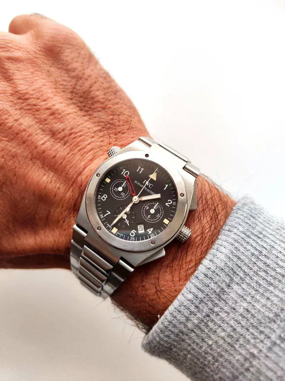 Viendo que IWC había decidido que prácticamente todos sus modelos fueran portados por los varones muñequifinos cual escudo vikingo, con medidas de 43, 44 y hasta 46mm, continué la búsqueda dentro de la colección Ingenieur de años 80 y 90 de la marca, cuando pensaban aún que había gente con muñecas de tamaños normales.