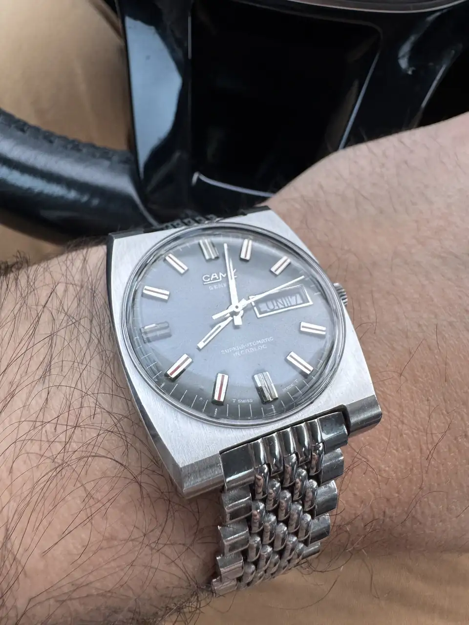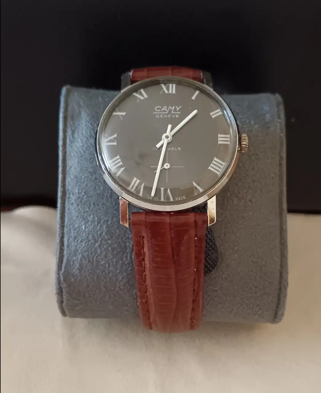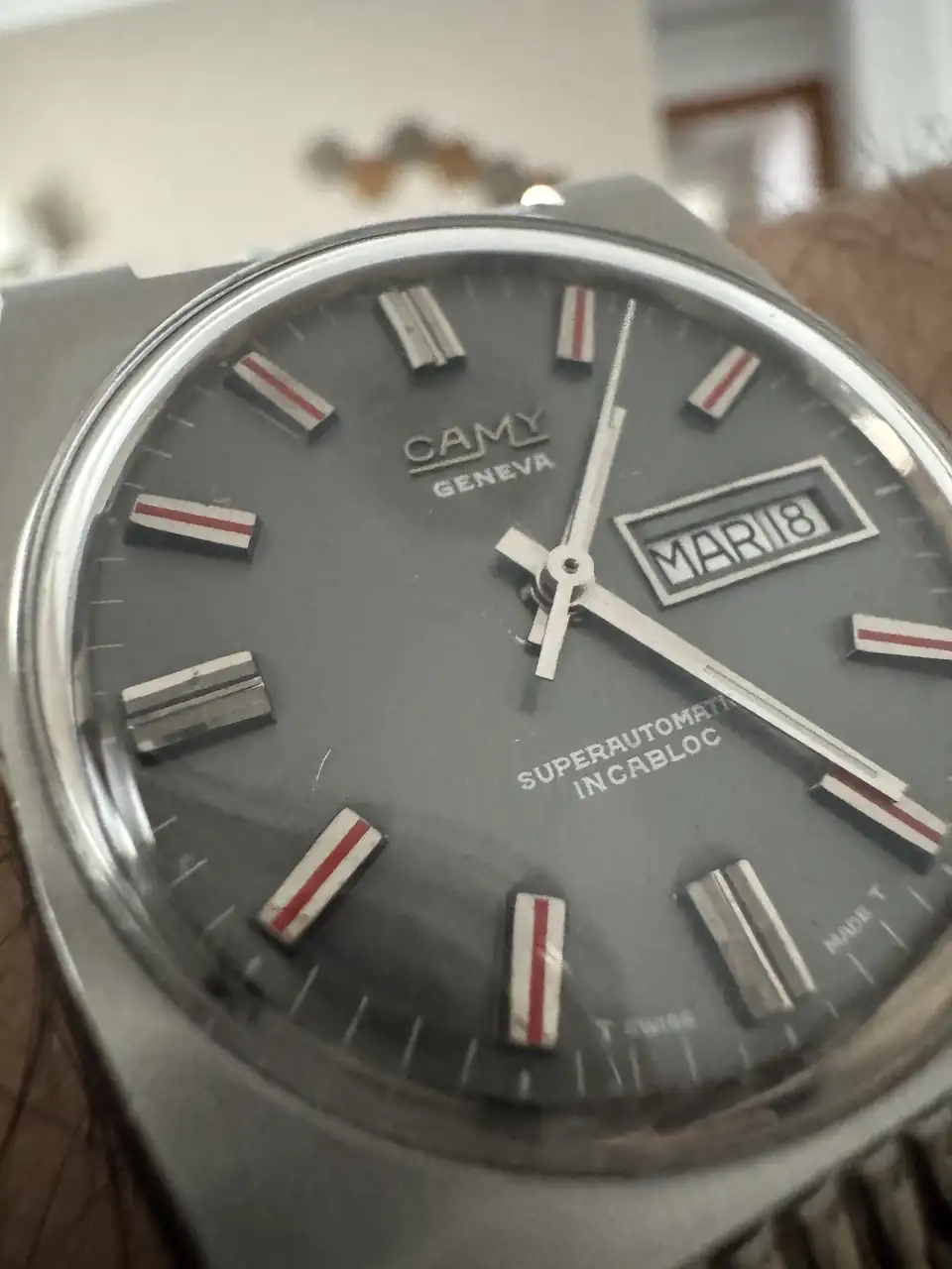 Esfera gris con índices plata y rojos , rarilla , pero me mola bastante .