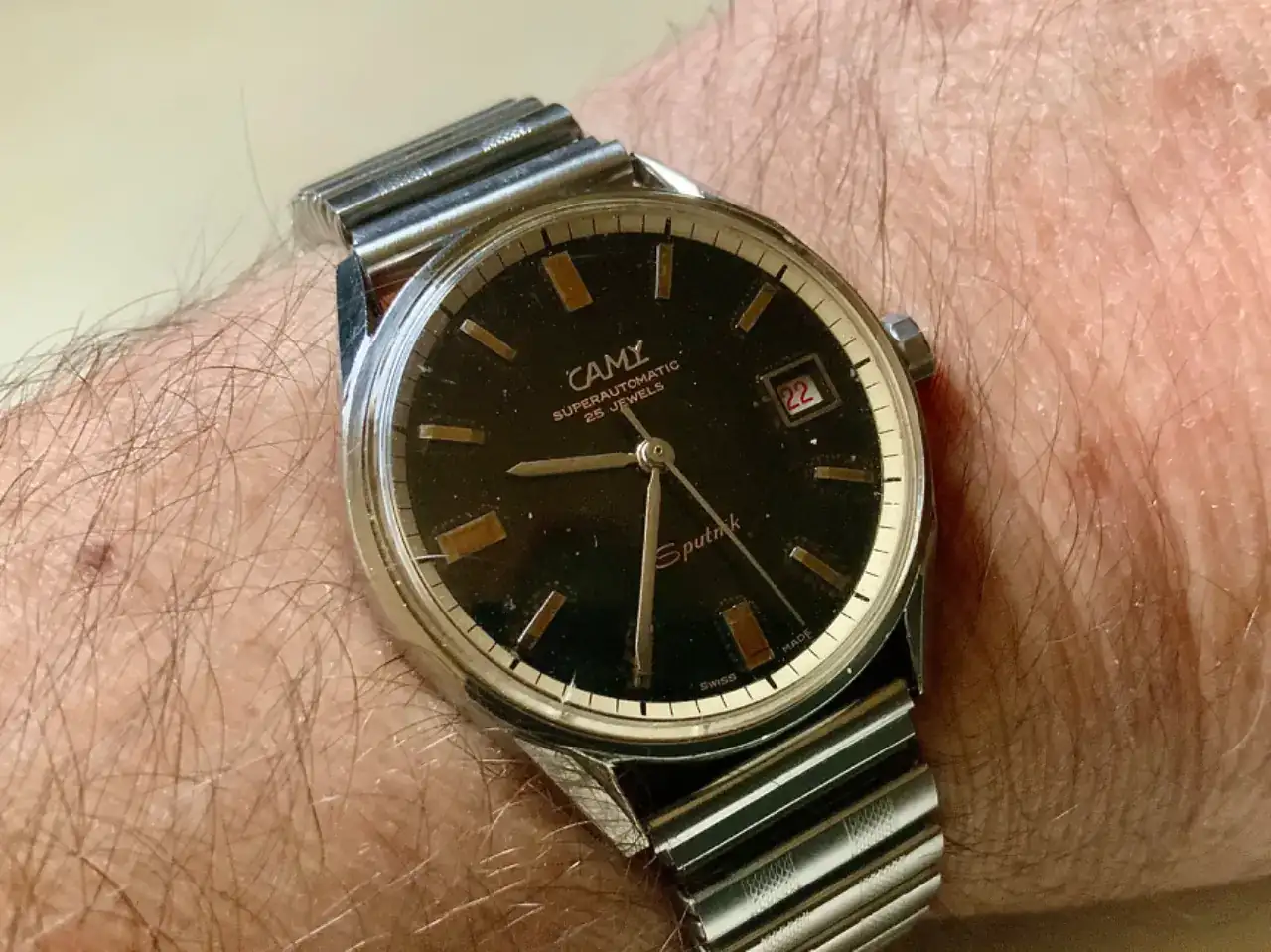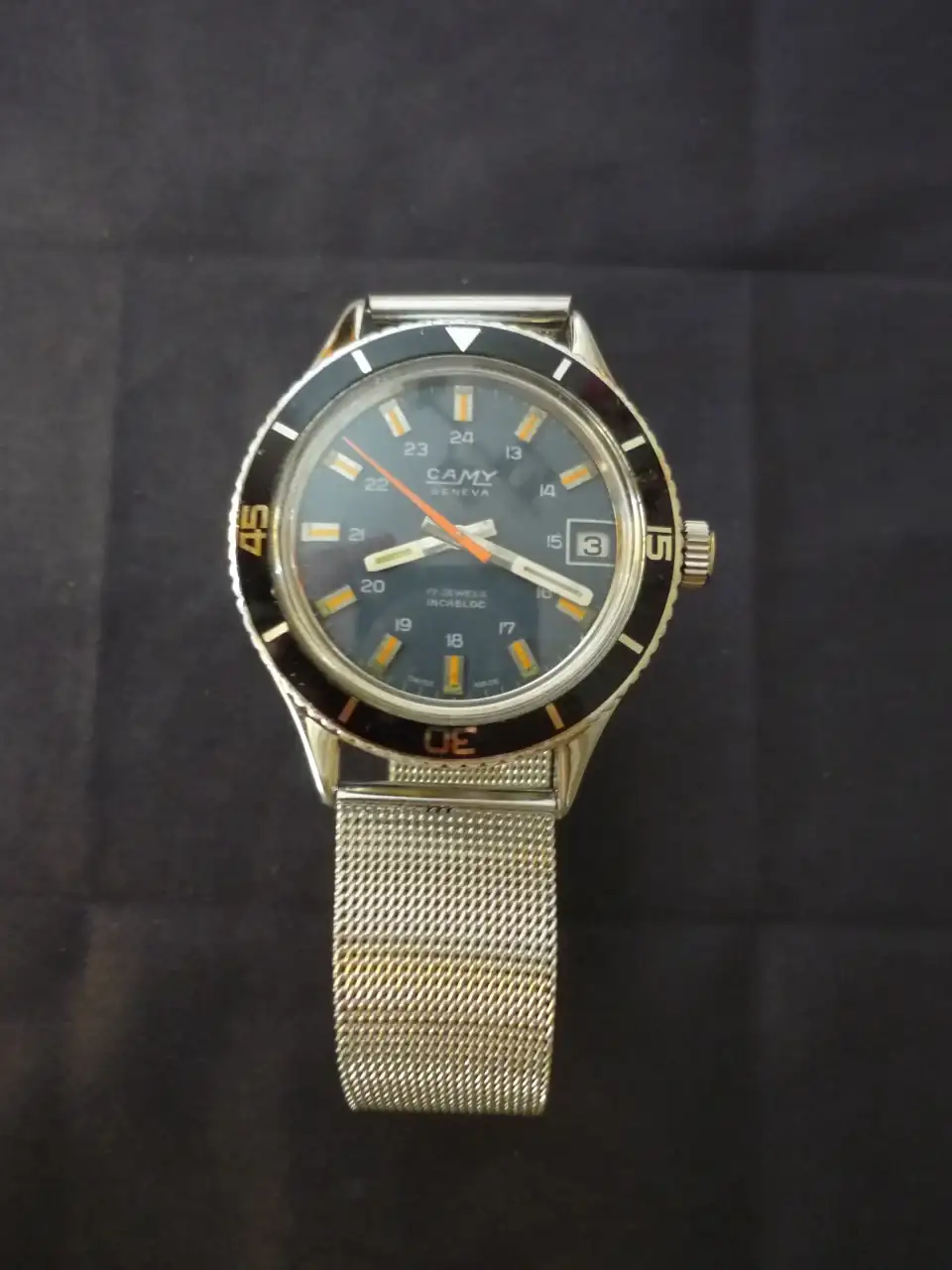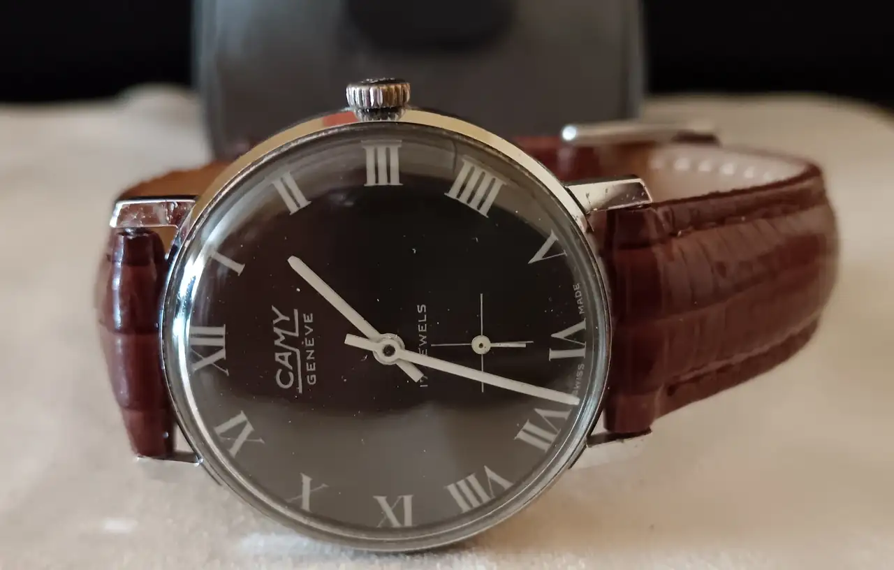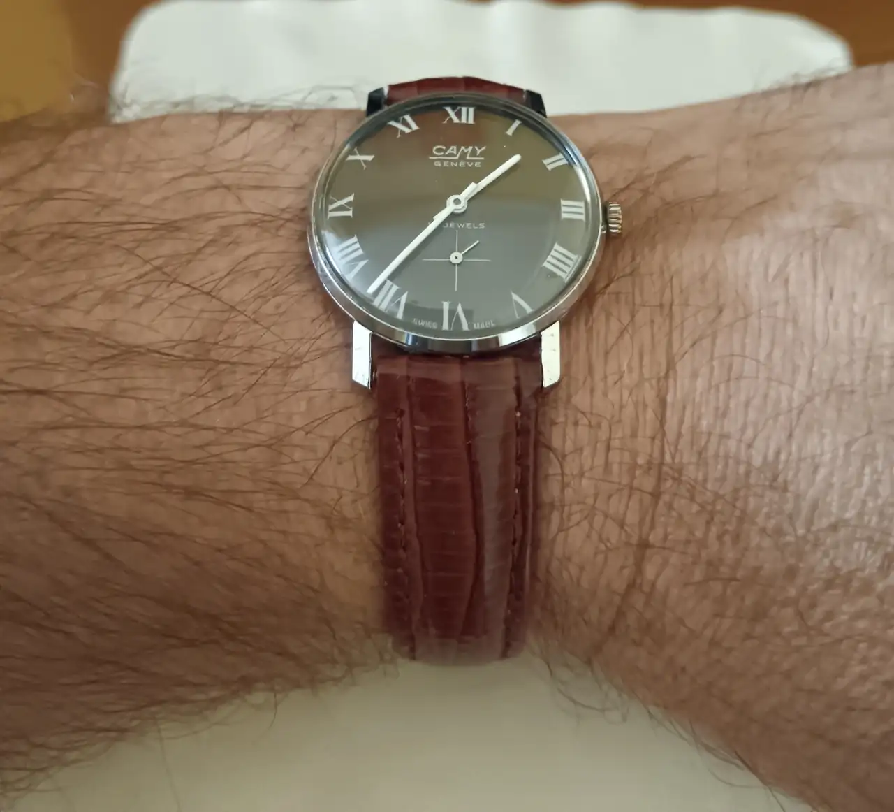 Esfera gris con índices plata y rojos , rarilla , pero me mola bastante .