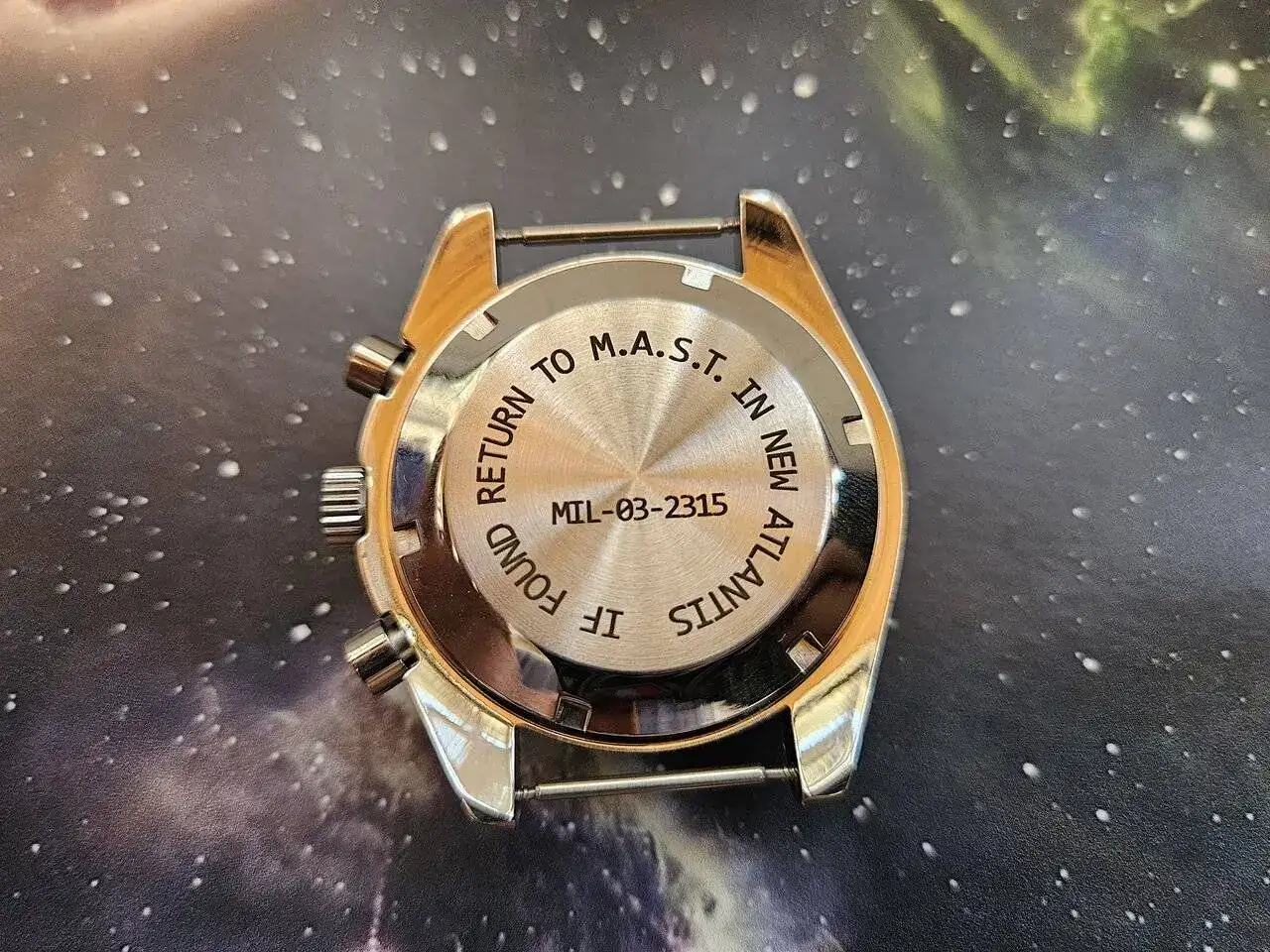 Por detrás lleva un grabado a láser. Me he inspirado para ello en los relojes militares de dotación y en las tapas de los Fifty Fathoms Mil Spec originales. De ahí que ponga "Si lo encuentra, devuélvalo al MAST (que es la sede de gobierno) de New Atlantis (la capital de las UC)"
