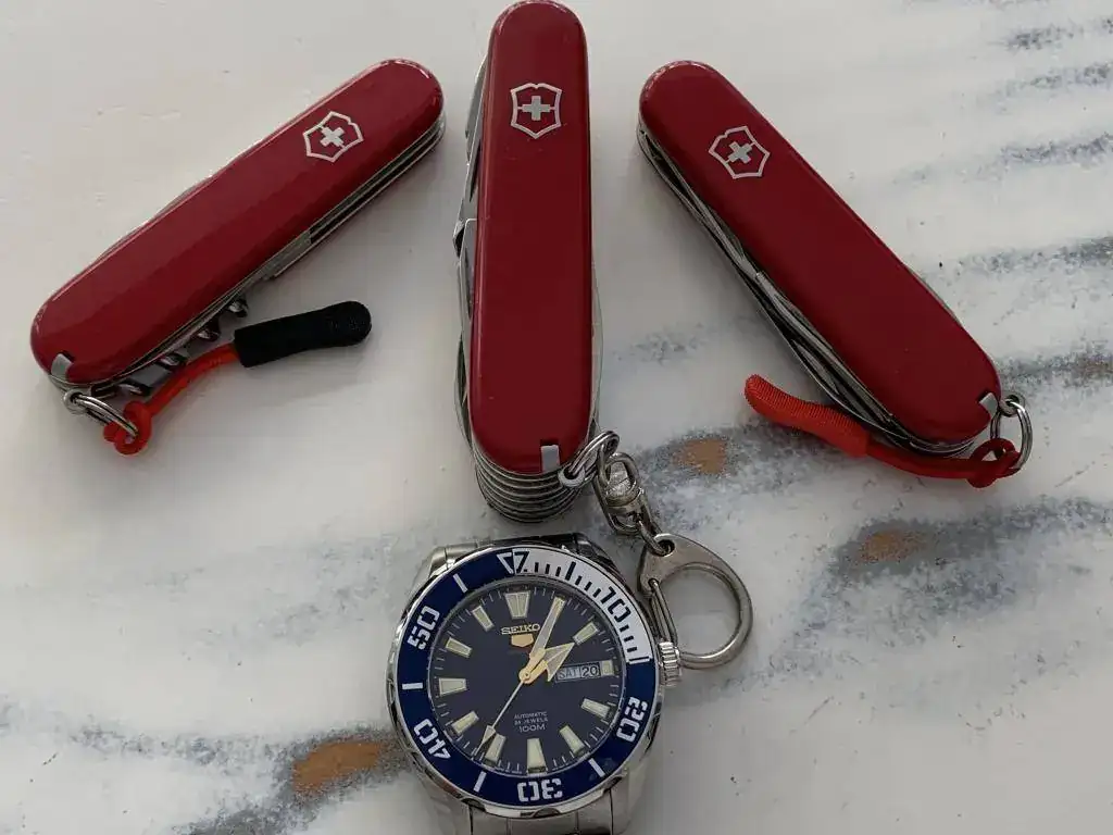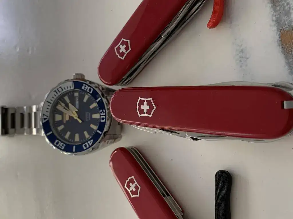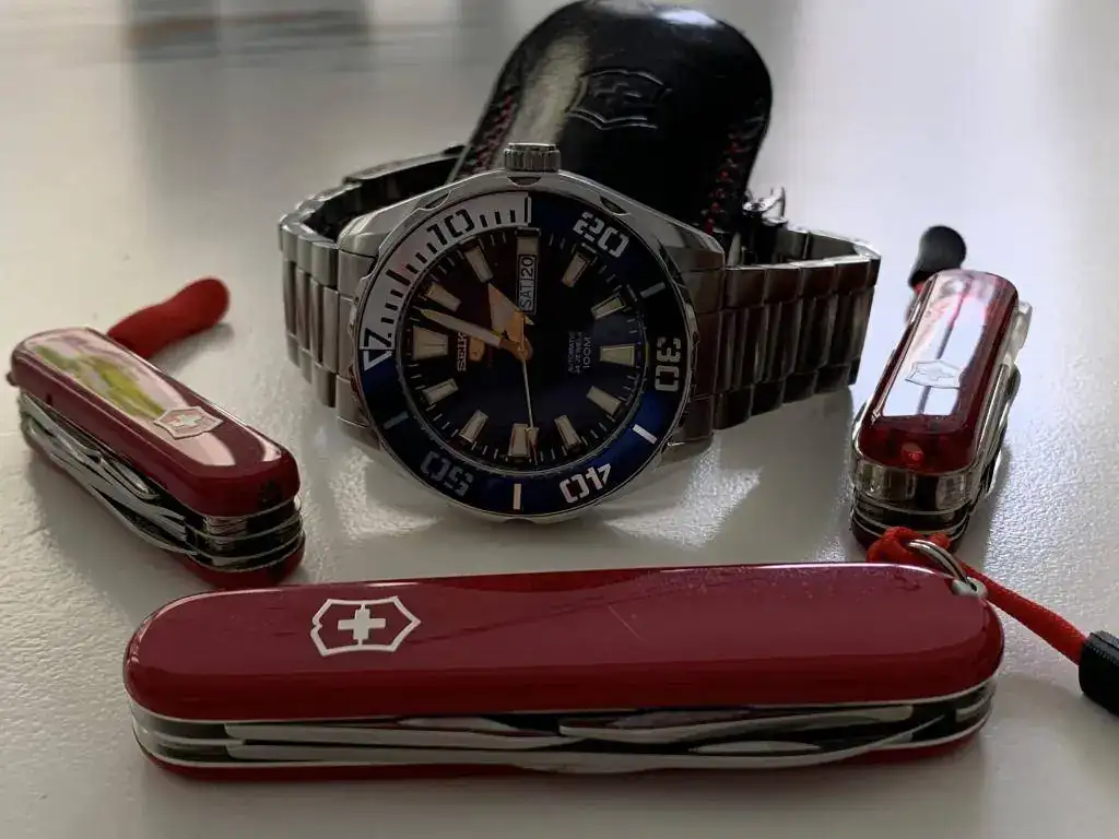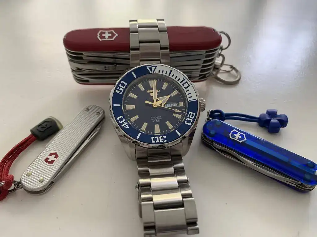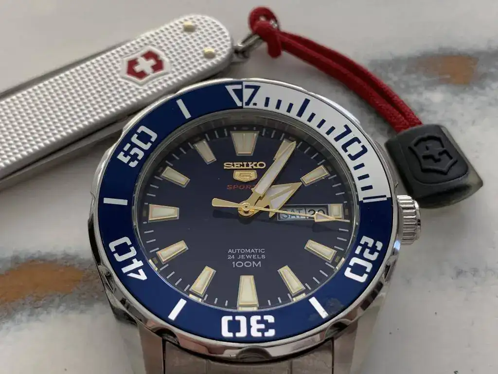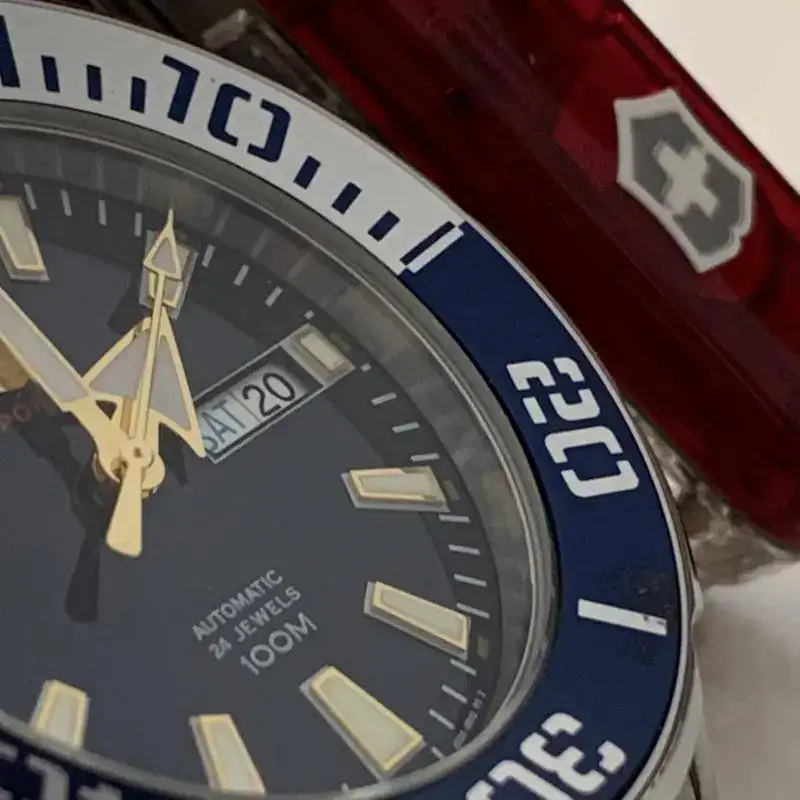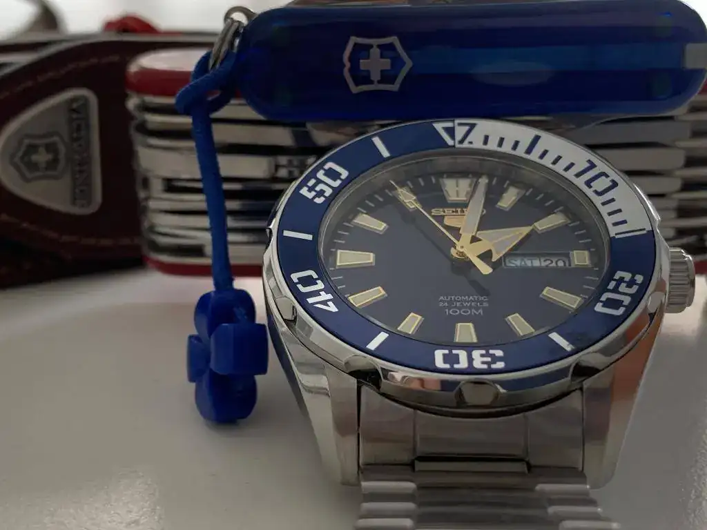 Se trata del Seiko SRPC51 que tengo desde hace pocos meses pero me encanta. No soy de dorados, es más, nunca me suele gustar nada o casi nada que tenga dorado pero este reloj, pese a sus adornos en dorado me encantó desde que lo vi. Ese azul distinto a lo habitual que vemos, su mezcla de blanco, azul y dorado me llenó desde el primer momento. Además tuve la suerte de poder comprarlo muy bien de precio, nuevo y por menos de 170 euros puesto en casa me pareció casi un robo. Aunque conozco las carencias que tiene como Diver, he de decir que raramente me sumerjo más de 1 metro en el agua, así que no creo que tenga problemas en ese aspecto. En cuanto al resto del reloj, ya poco he de decir que no se haya dicho cientos de veces.