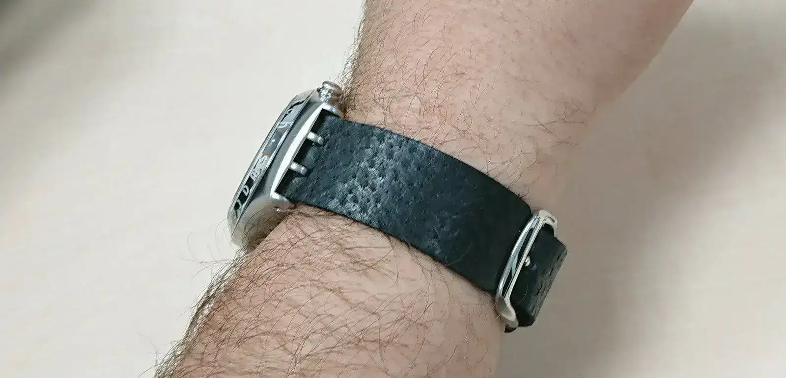 Y cómo podréis haber apreciado, le hice una correa de cuero negro. Usé peccary, concretamente un corte de cuero de espesor inferior a 0,8 mm. Lo elegí por su gran flexibilidad y suavidad (se suele usar para interior de bolsos, carteras o en la fabricación de guantes por estas cualidades). El bajo espesor lo hace ideal para esos usos, pero para la próxima correa que haga me gustaría hacerla de más capas para que no haya tanto espacio entre correa y caja. Aquí la correa en detalle: