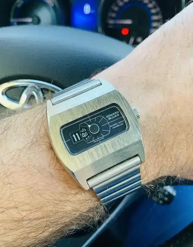 Jajajaj!! Compañero coronado,pues es un horas saltantes de cuerda manual. No se de que año exacto es,pero se que es de los 70’s y tambien son llamados digitales. Como ves en las ventanillas sale hora/minutos y los segundos es con trotadora. Siempre me han gustado los horas saltantes,pero nunca vi uno que me gustase y este lo vi y senti mariposas en el estomago y aqui esta,en casa!! Gràcias por preguntar amigo,si te pasas por vintage veràs que hay varios compis con un horas saltantes.cuéntanos algo sobre este compañero??