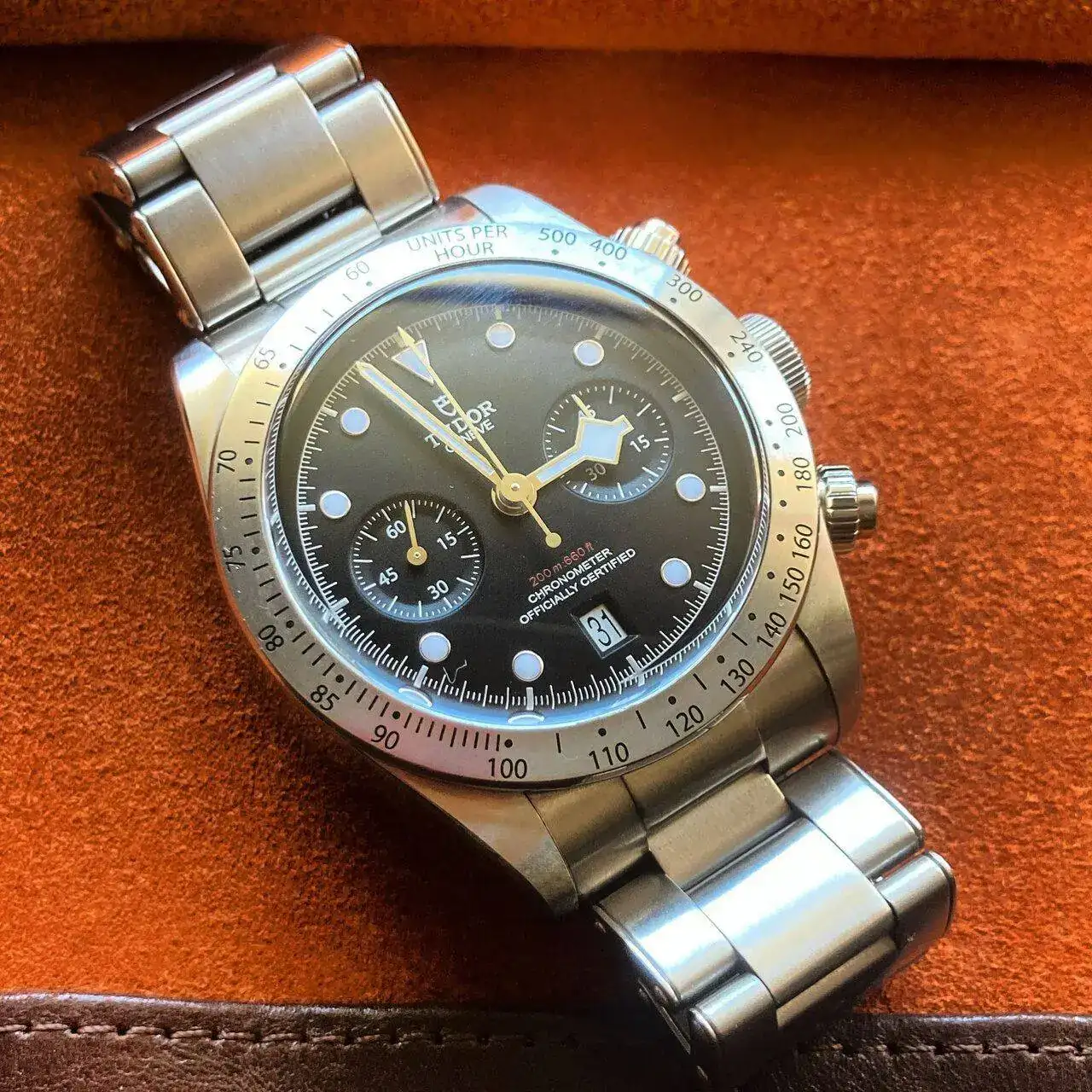 ¡Ah! ¿Qué esperabais un dial diferente? Pues es que este BB Chrono, lleva en su interior un B1 (con órgano regulador Rolex, ¡toma ya!) fruto de la colaboración/acuerdo entre las dos entidades: Breitling cedería a Tudor su B1, mientras que esta les cedería su MT5612 (sólo hora).