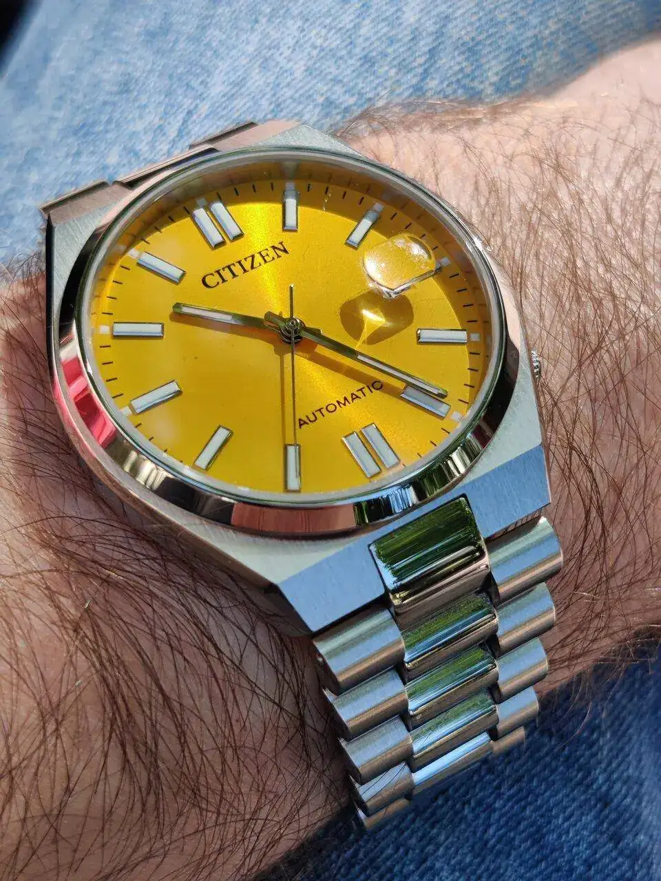 ¡Precioso! Enhorabuena por el reloj, por el aniversario y por esa mujer que es un tesoro. El Citizen te queda de miedo, de tamaño perfecto, y el color me gusta mucho para ese modelo, un color discreto y elegante con un efecto rayos de sol precioso, en un reloj con esa elegancia a lo Gérald Genta que me encanta, con la caja de acero cortado y el brazalete President perfecto en este estilo.