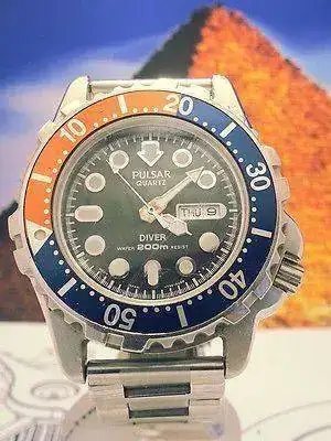 Diver de los 90 con caja y manecillas del 7548 de Seiko, pero el calibre inferior 7546 En la década de 1990, Pulsar expandió nuevamente su línea de productos al agregar relojes de titanio a sus catálogos, tanto en deportivos como de vestir y comenzó a incluir nuevas características, como la tecnología de circuitos integrados y el segundero de movimiento gradual, que le indicaría al usuario cuando la batería está llegando a su fín.