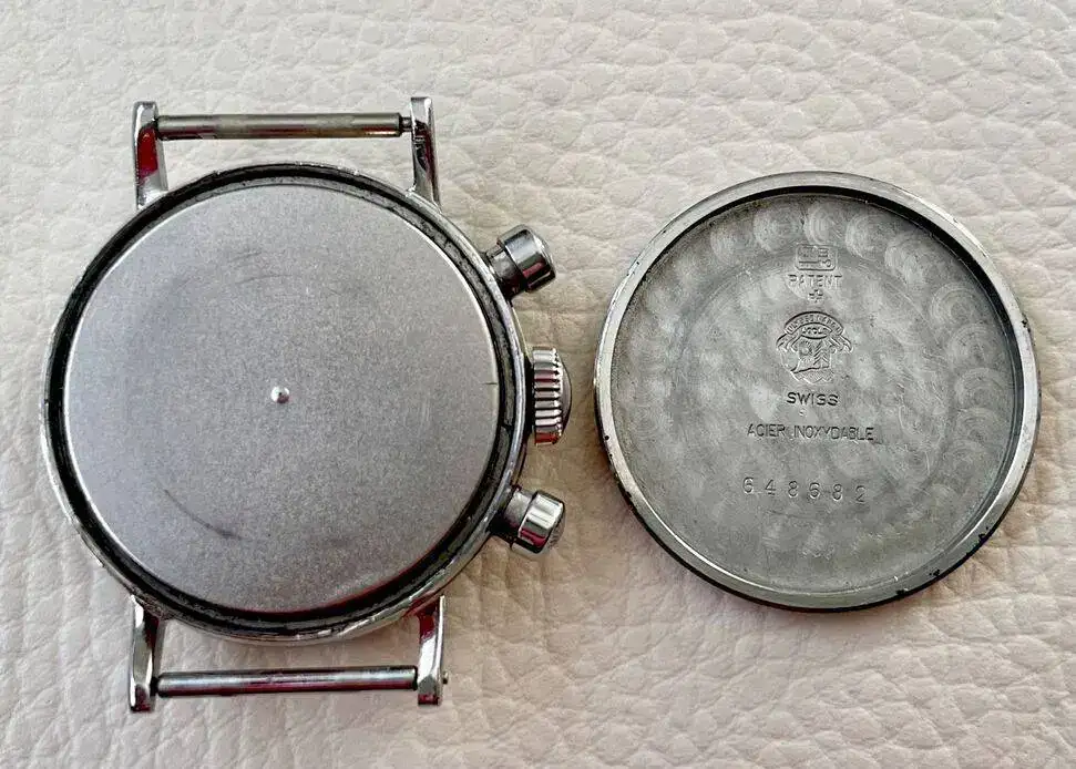 Pero no es todo, el movimiento esta ubicado en una caja de Francoise BORGEL, firmado en la tapa de rosca con un sello; FB y una llave. Eran los primeros cronografos impermeables y Borgel fabricado estas cajas para Patek Philippe (Ref. 1463), Vacheron Constantin con calibre 434 (base Valjoux VZ), Mido Multicenter Chronograph con un Valjoux 23 (cambiado a un contator de minutos del centro, primero del mundo), Movado cronografo con calibres M90 y M95 (una propia construcion de Movado con modulo de cronografo y el cronograph de Ulysse Nardin en muy pocas unidades, si no eran a pedido, pero esto no lo se.